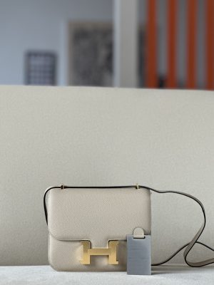 Hermès Constance 24: Measuring about 9.4” x 6” x 2”. The original C24 has 3 compartments for organization. In 2023, Hermès released the Constance 1-24, which has just one large compartment and a less boxy shape. Both the C24 and 1-24 are the same size and have the same strap drop. If you prefer the classic 3 compartment style, Hermès still offers the original Constance 24.