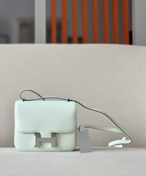 Hermès Constance 18 (also called Mini Constance): This size measures around 7” x 6” x 2”. It has 2 compartments and a 20” shoulder strap drop so most women can wear it comfortably across the body. The Mini Constance is perfect for those who prefer a smaller, lighter bag. The updated version has a removable mirror on the front wall.