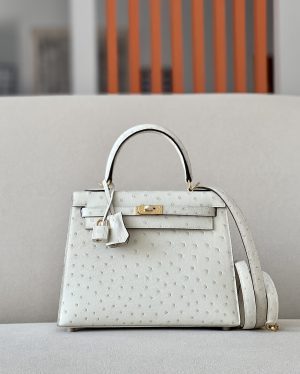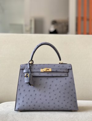 Kelly 25 Ostrich Gris Agate (82) Gold Hardware