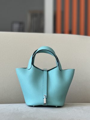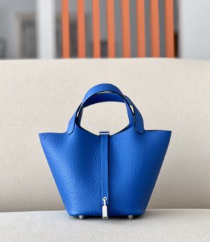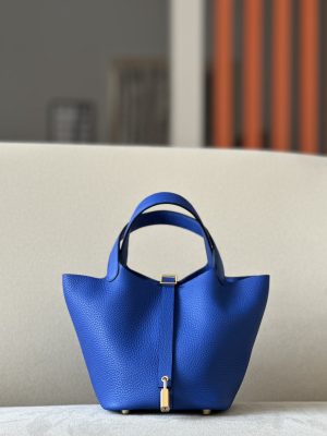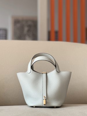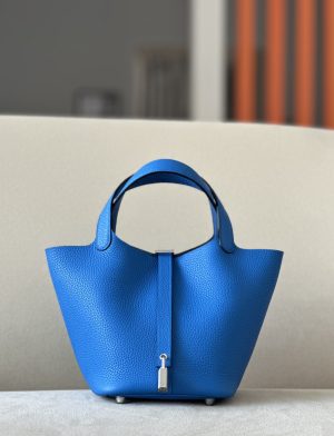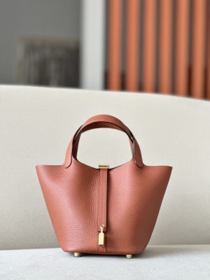 The Hermès Picotin is an elevated bucket bag. Open top design for easy access. Leather tab and H lock for closure. Four stud feet on the bottom so it won’t scratch.