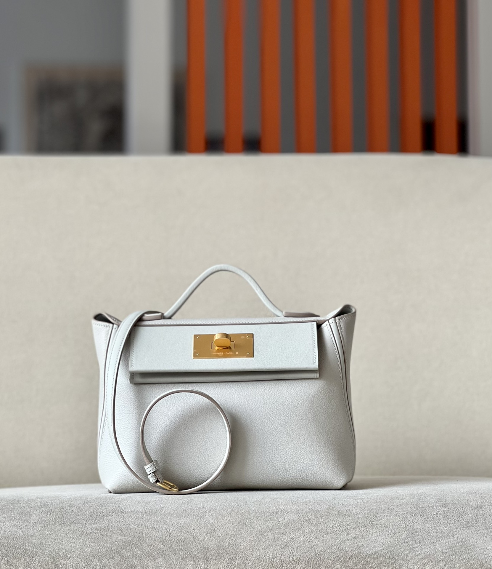 Includes ribbon, care booklet, dust bag, paper bag and box.