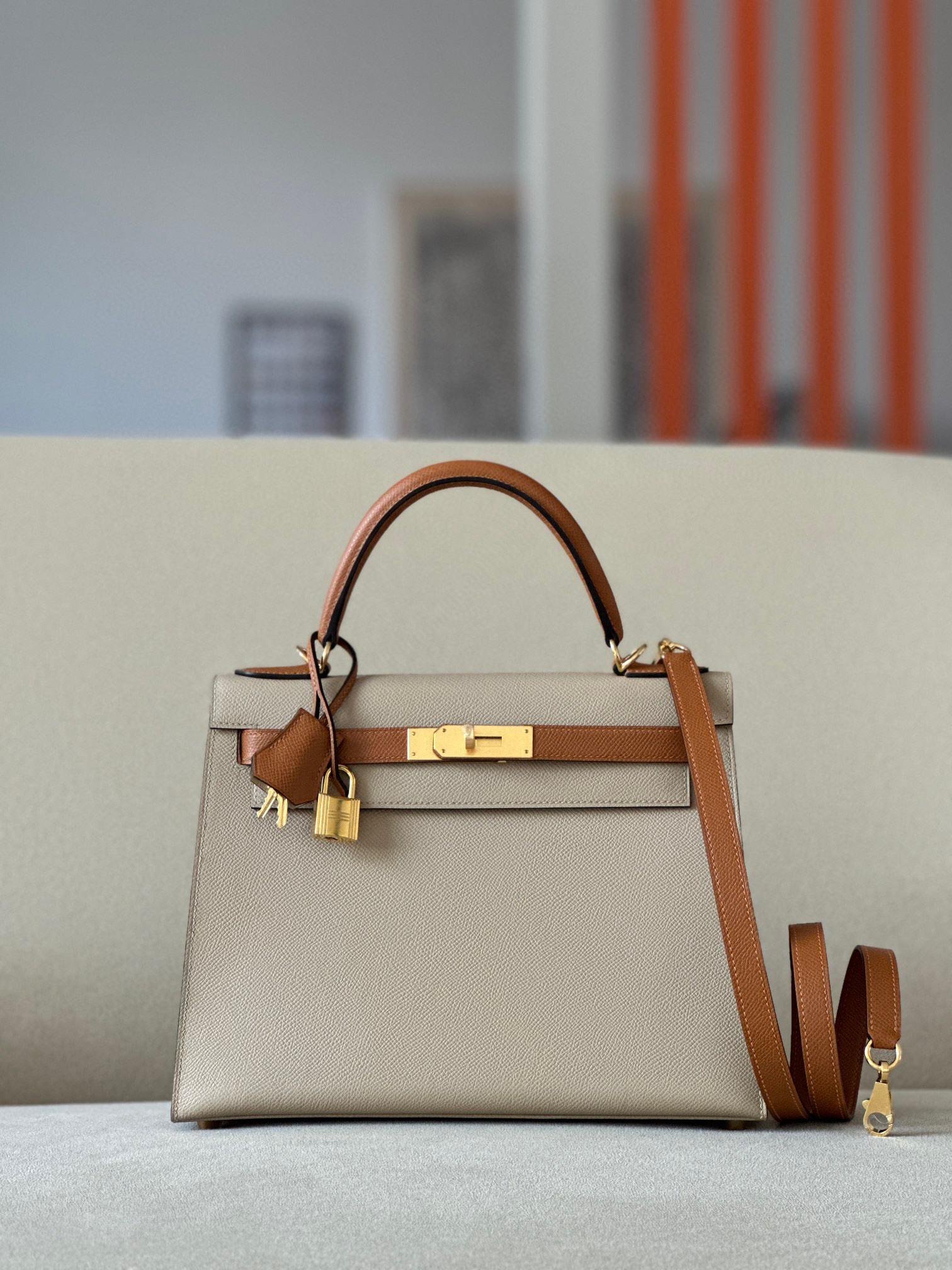 Includes lock, two keys, clochette, clochette dust bag, ribbon, care booklet, raincoat, felt protector, dust bag, and box