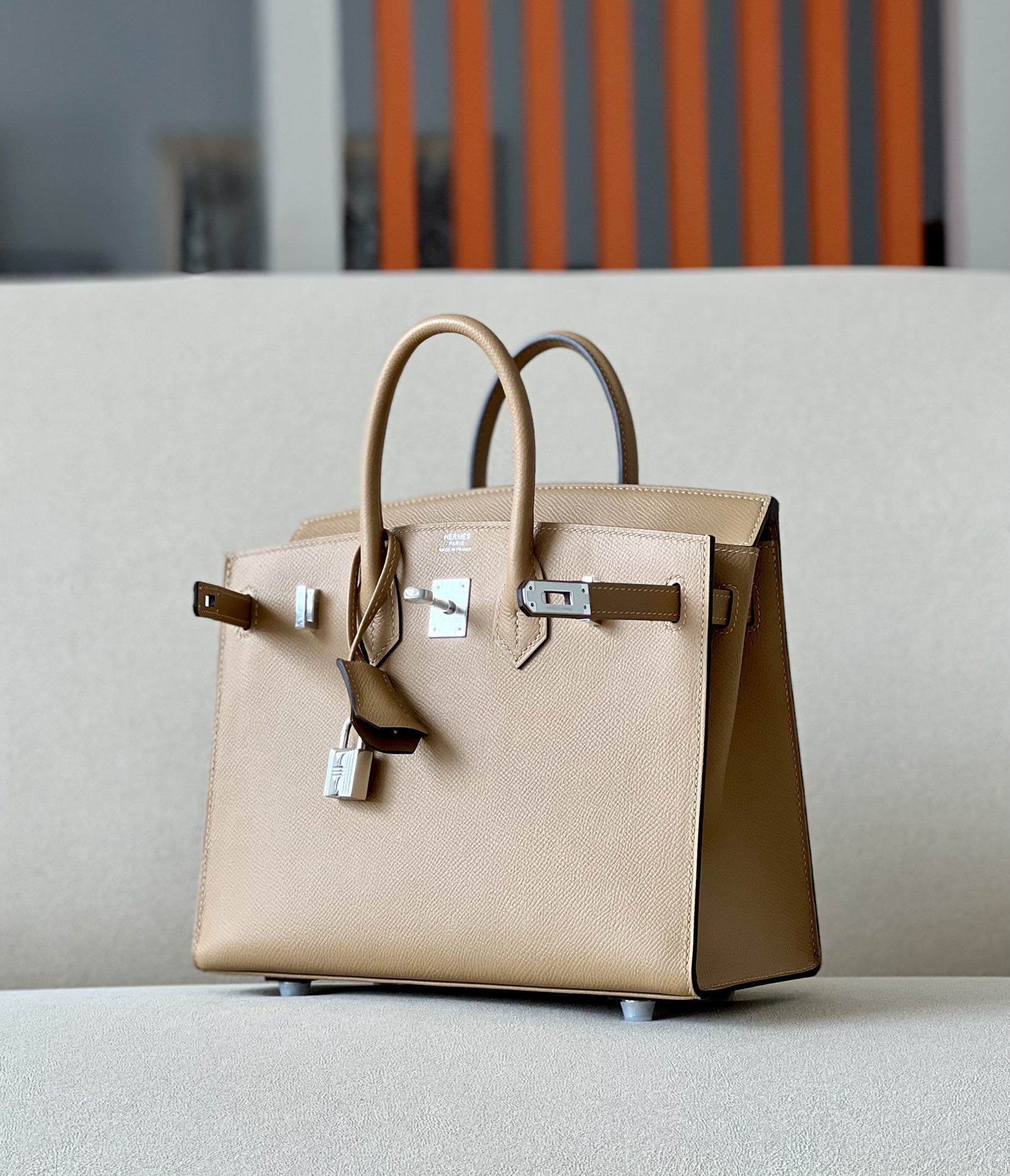Includes lock, two keys, clochette, clochette dust bag, ribbon, care booklet, raincoat, felt protector, dust bag, and box .