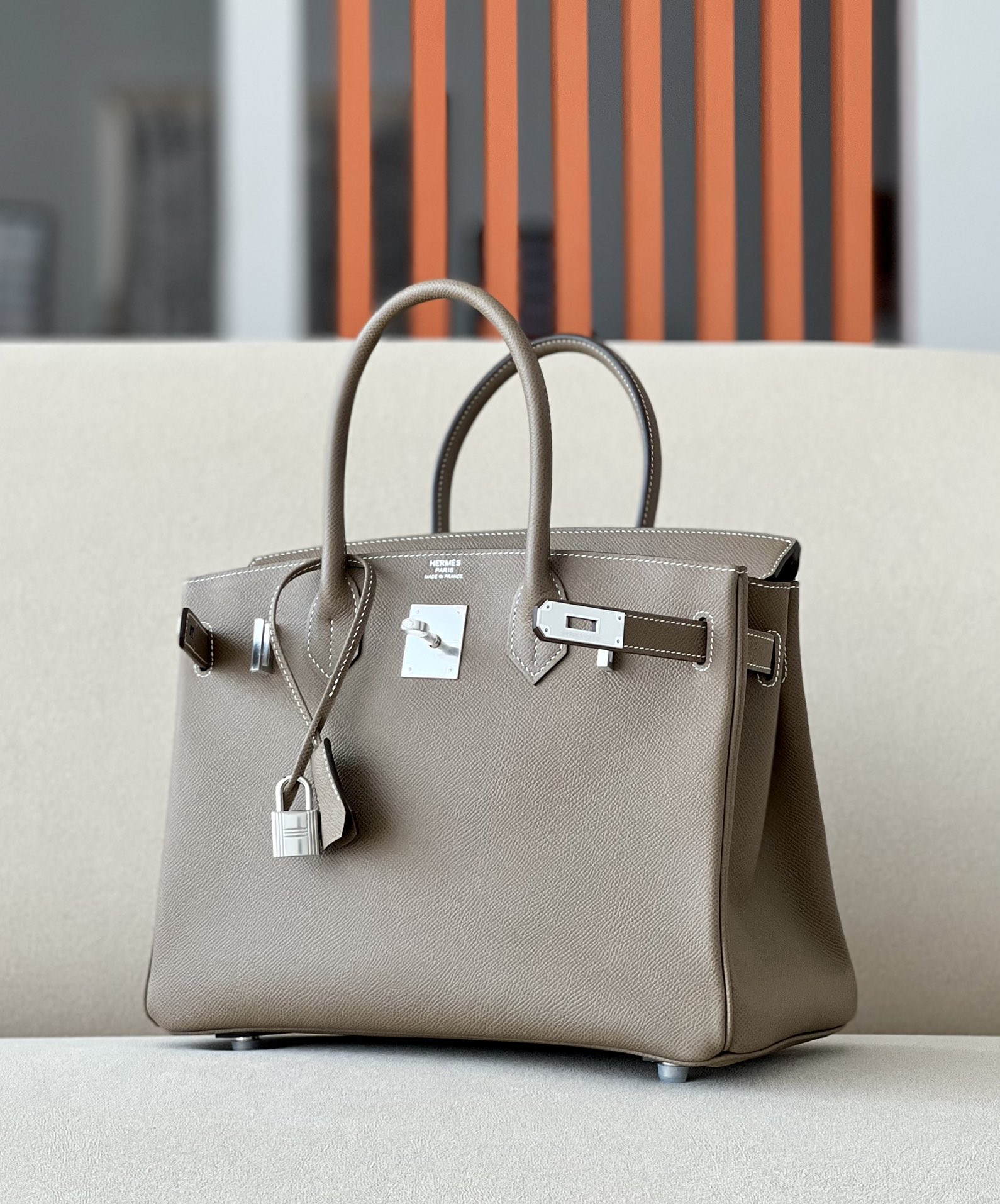 Includes lock, two keys, clochette, clochette dust bag, ribbon, care booklet, raincoat, felt protector, dust bag, and box