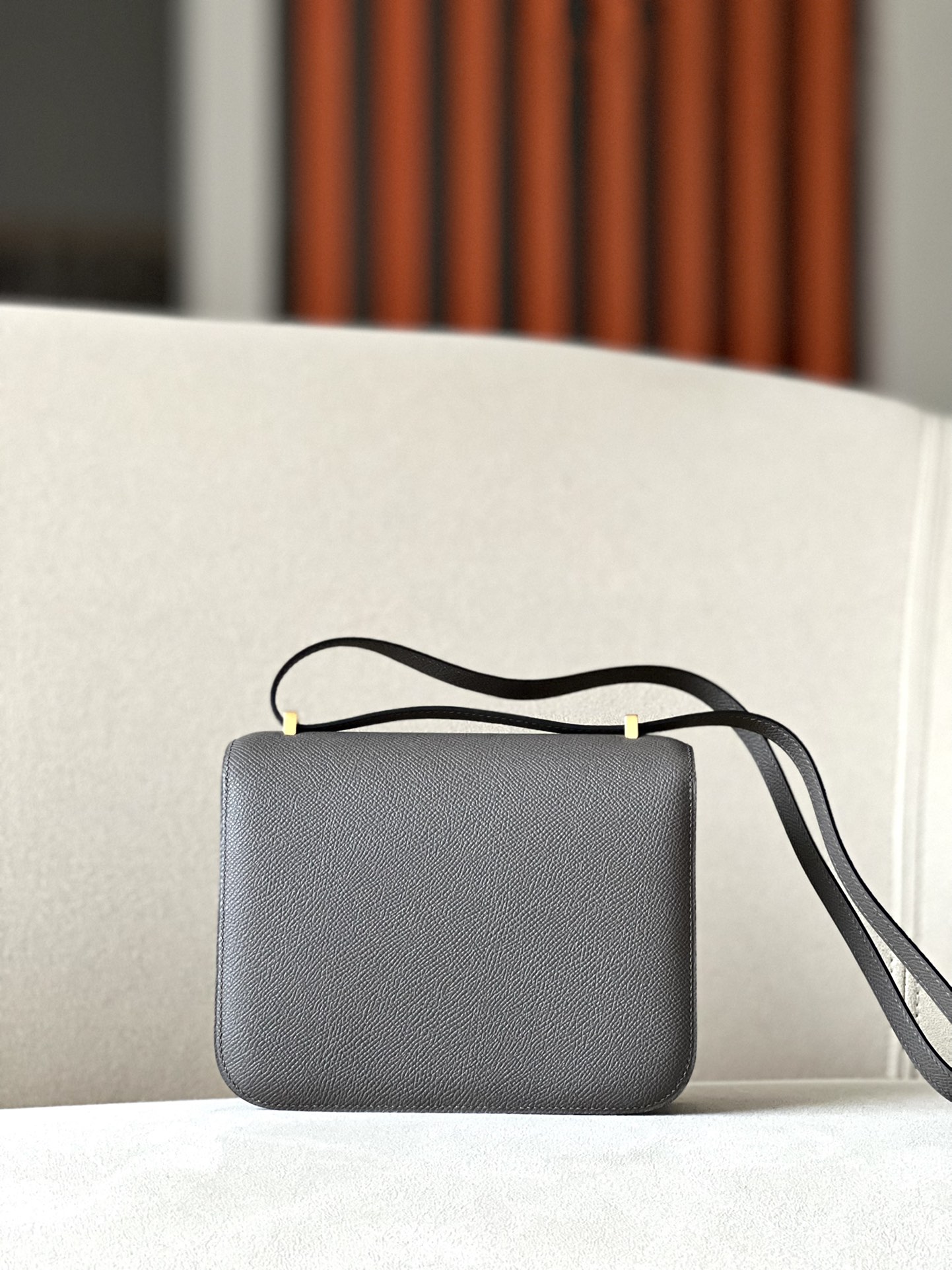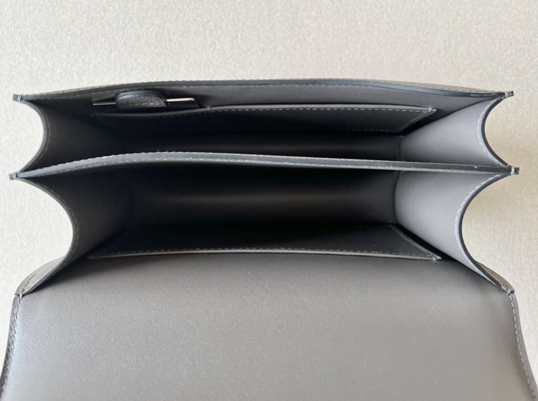 The bag features a long shoulder strap , including an H buckle on the flap.