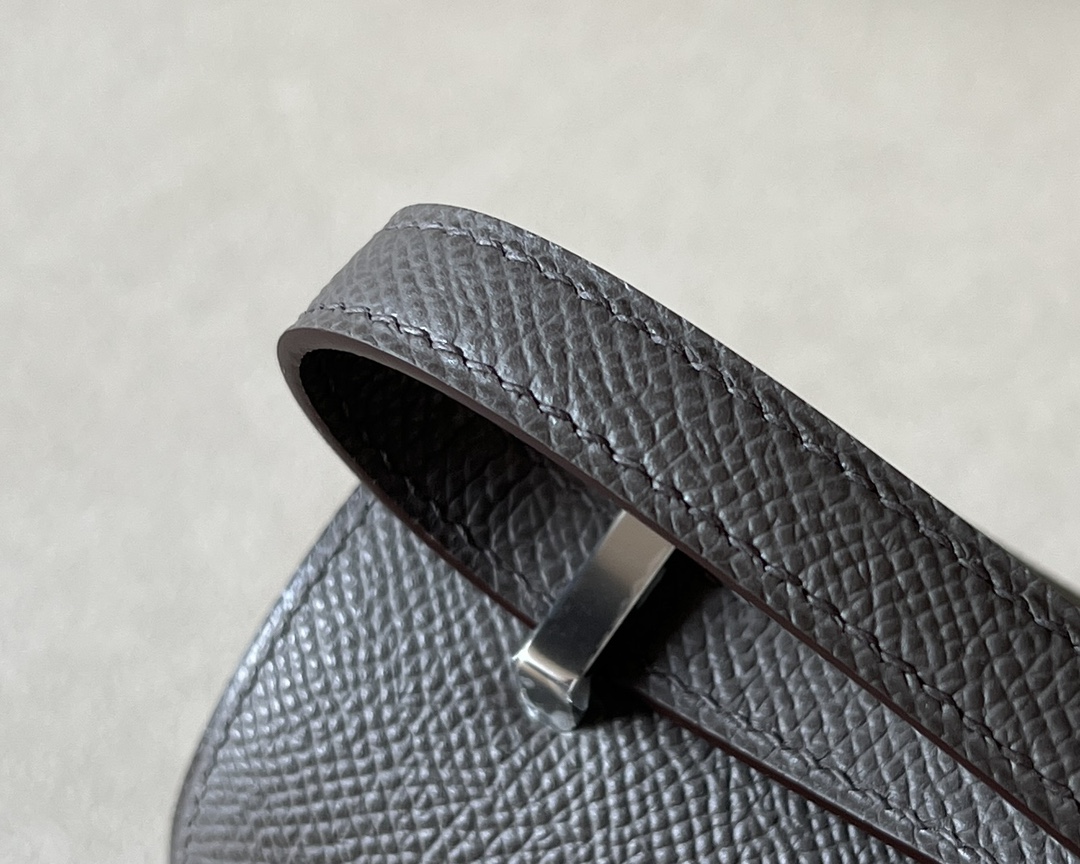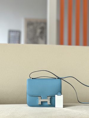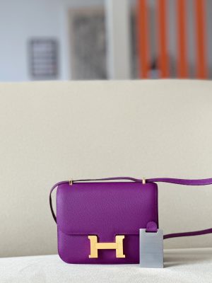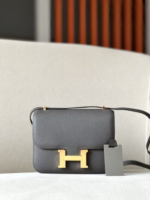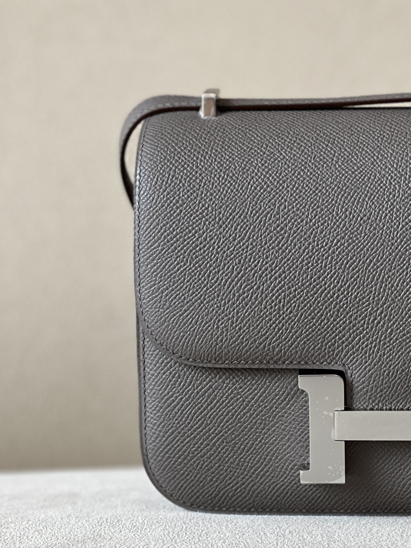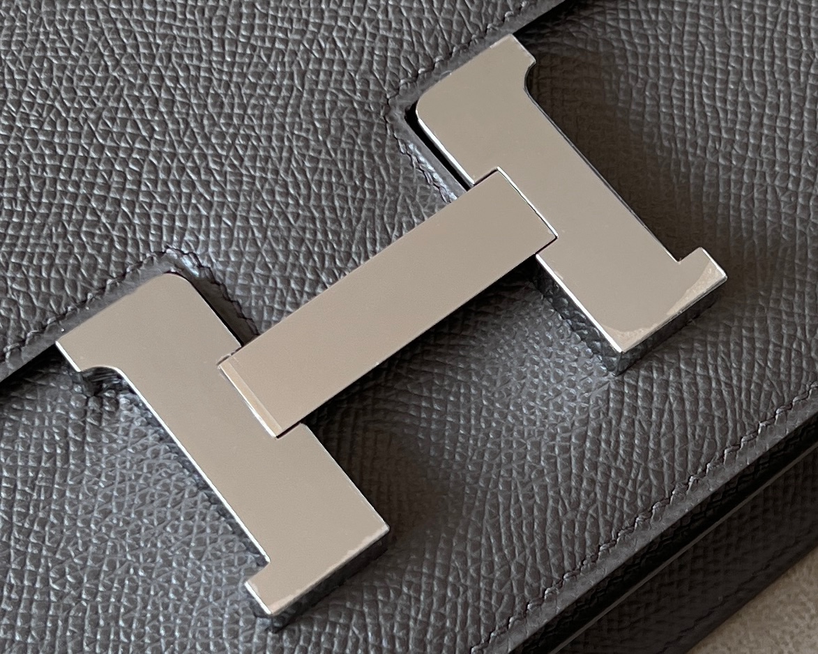 The bag features a long shoulder strap , including an H buckle on the flap.