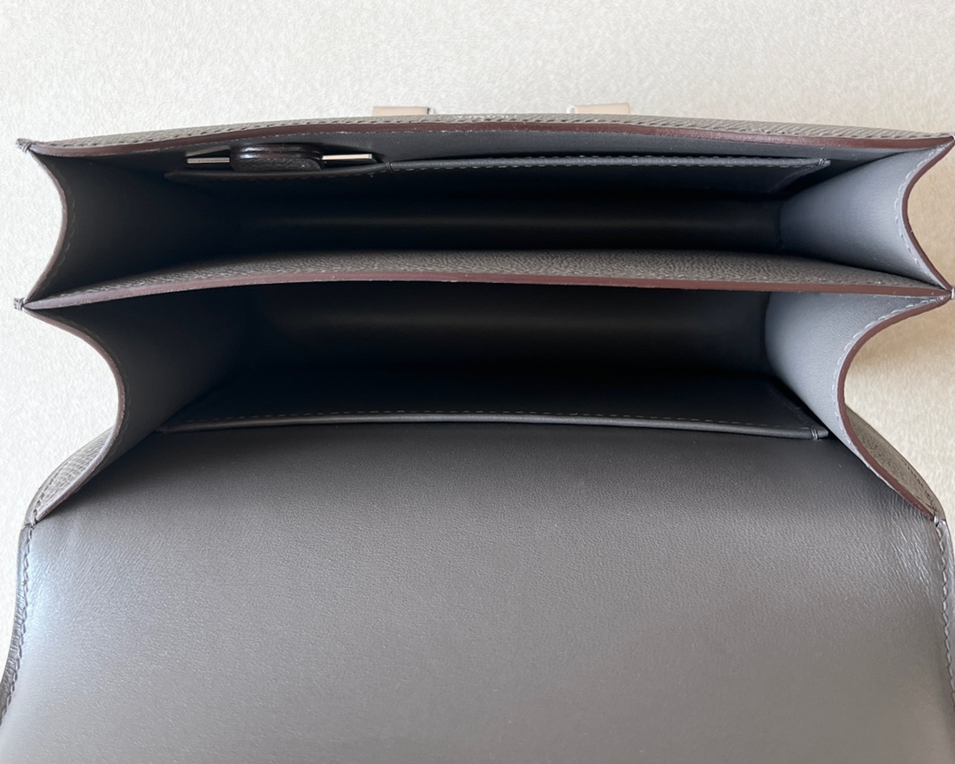 Lining in leather, two compartments, one patch pocket.
