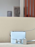 The bag features a long shoulder strap , including an H buckle on the flap.