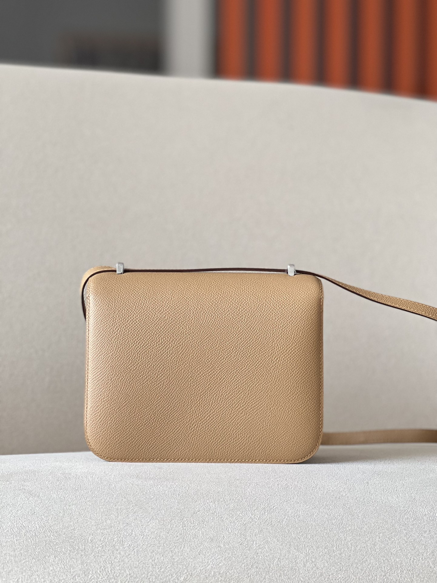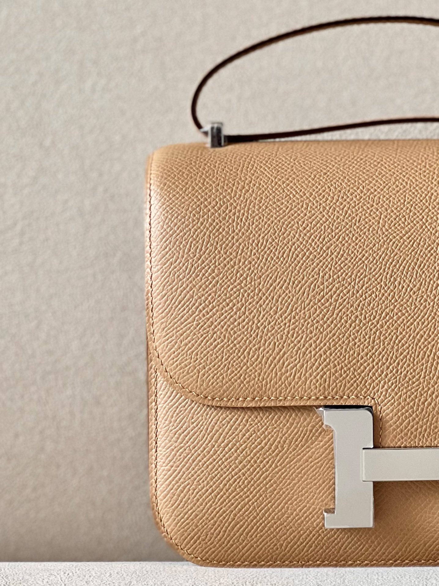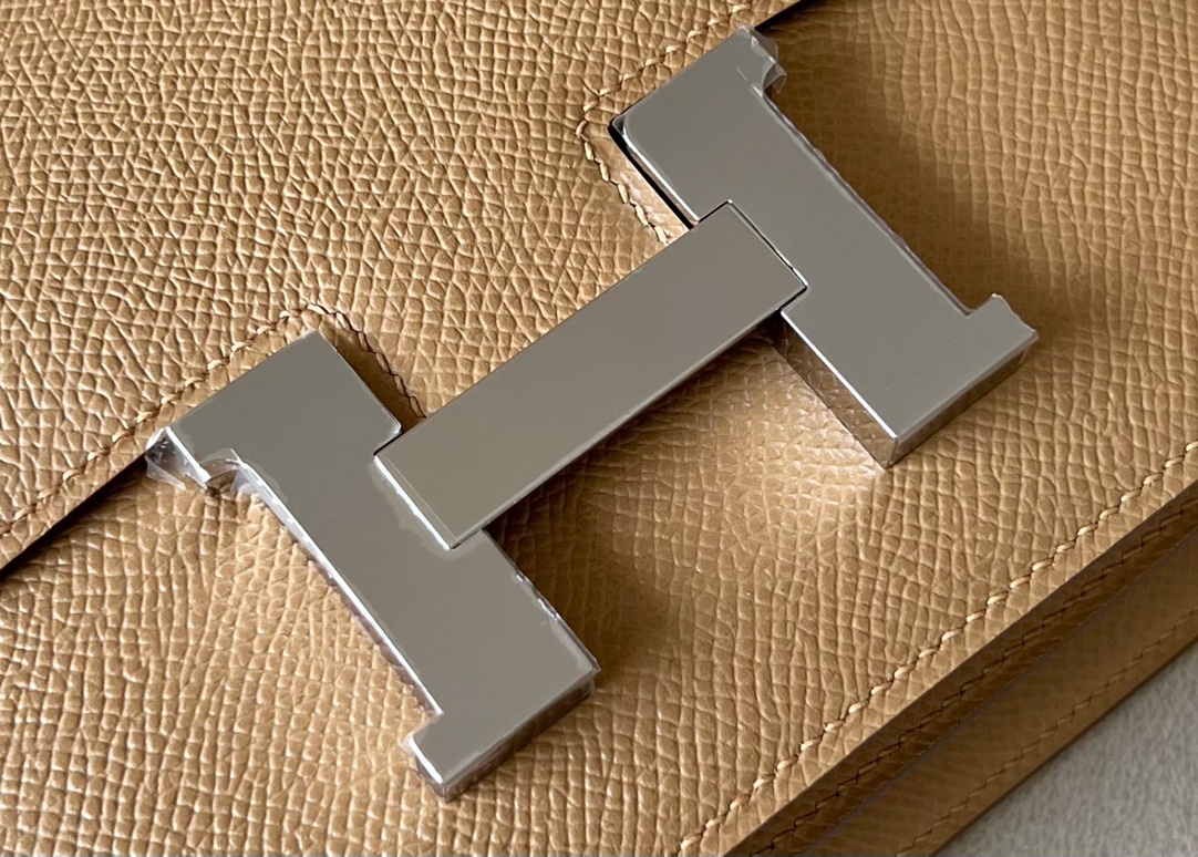 The bag features a long shoulder strap , including an H buckle on the flap.