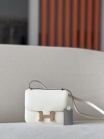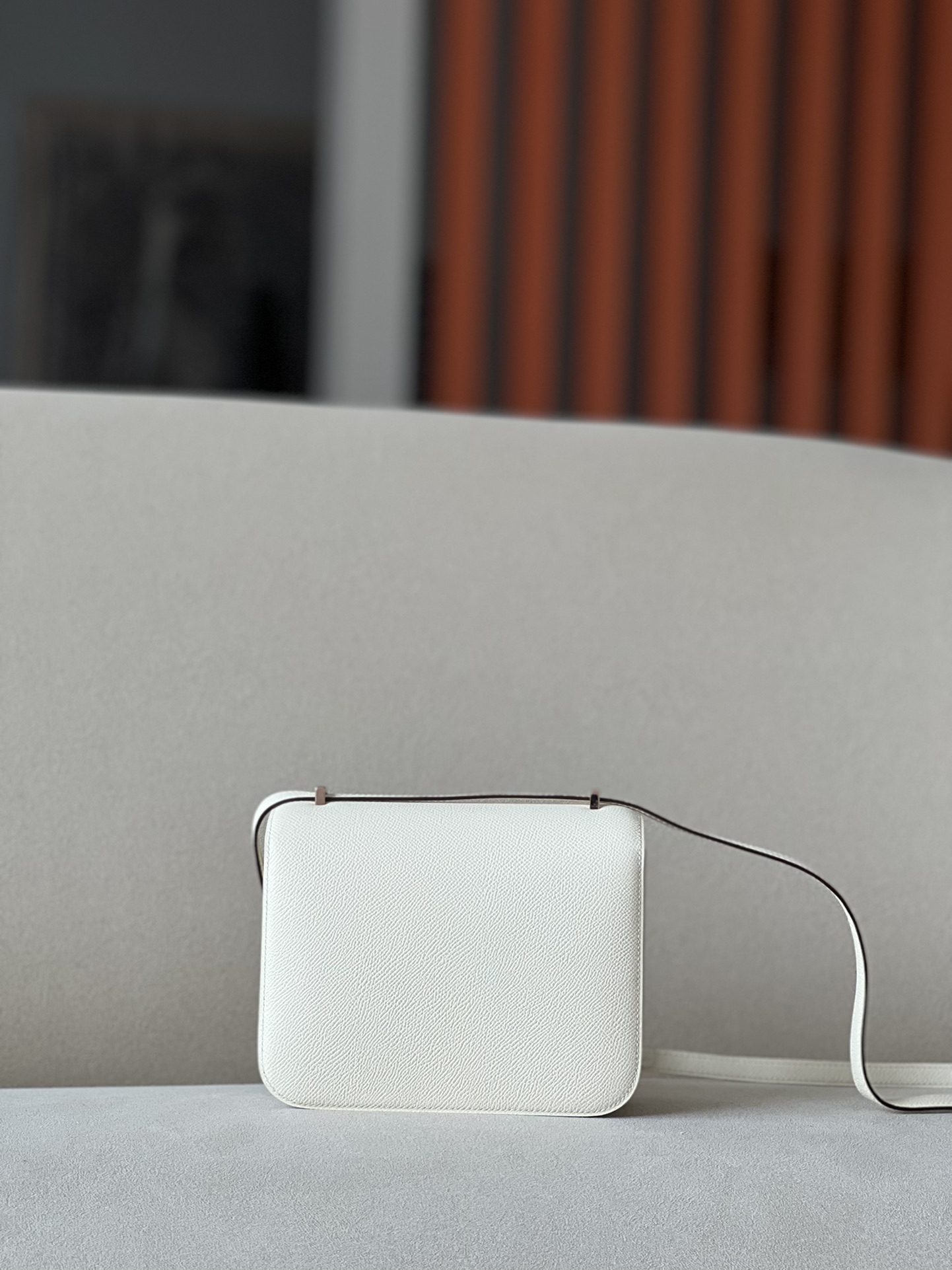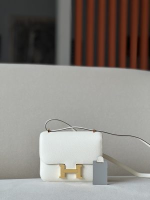The bag features a long shoulder strap , including an H buckle on the flap.
