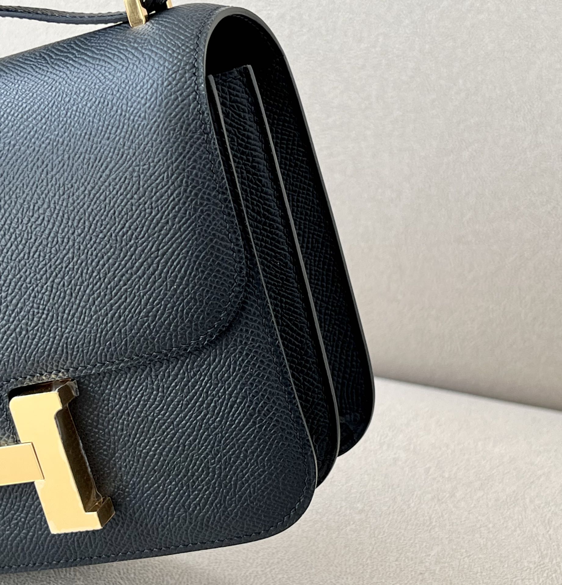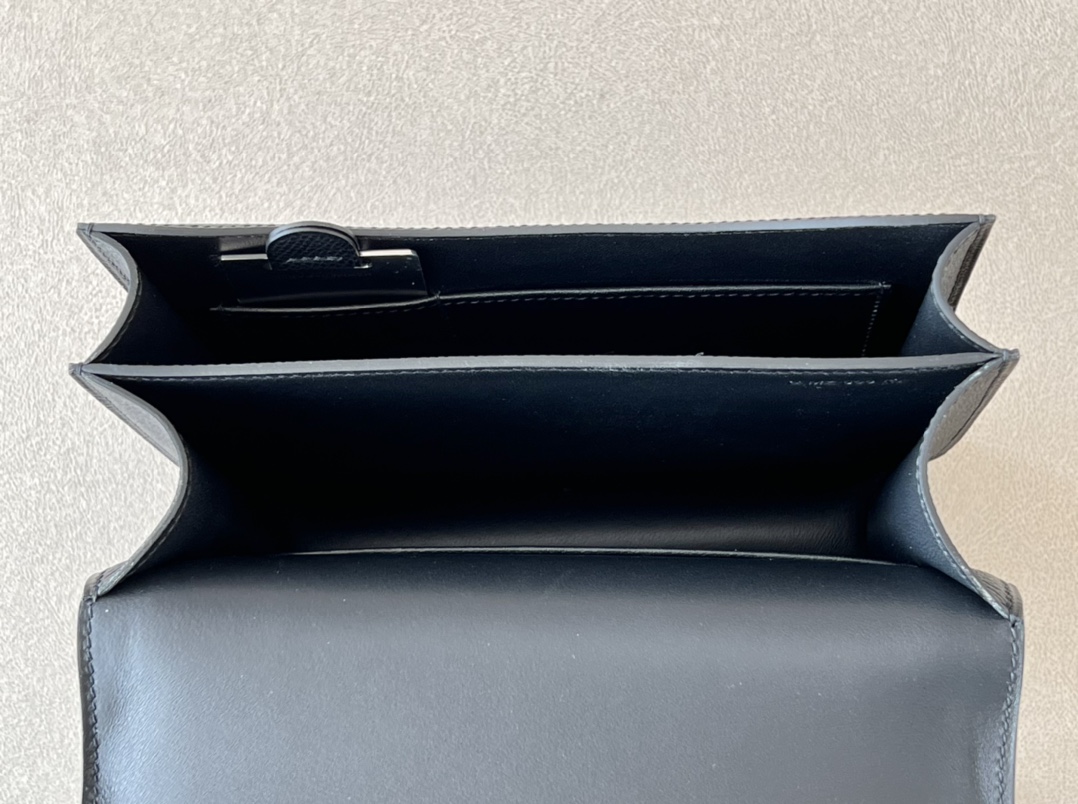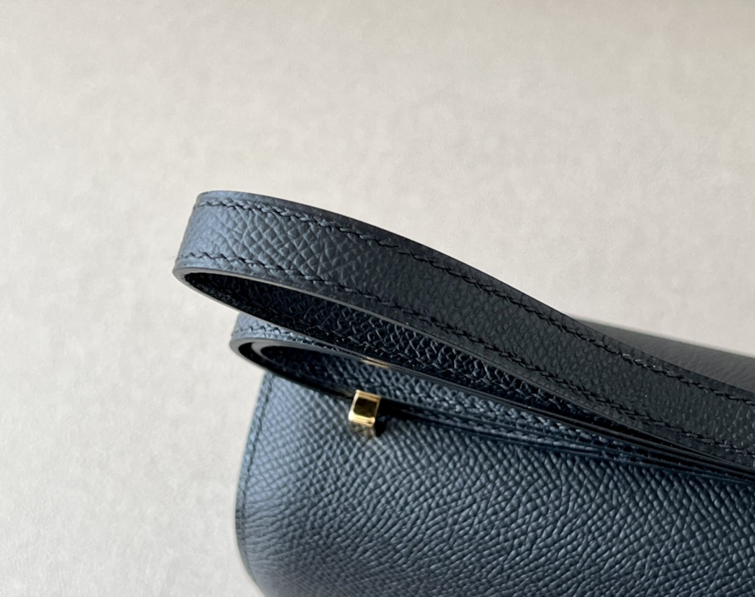 The bag features a long shoulder strap , including an H buckle on the flap.