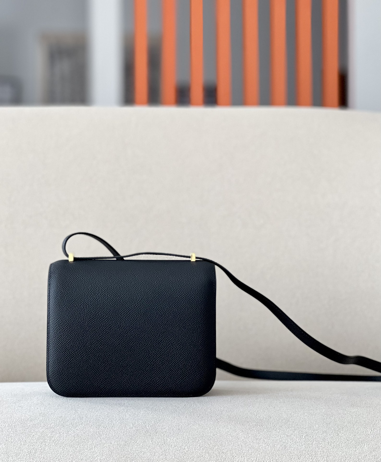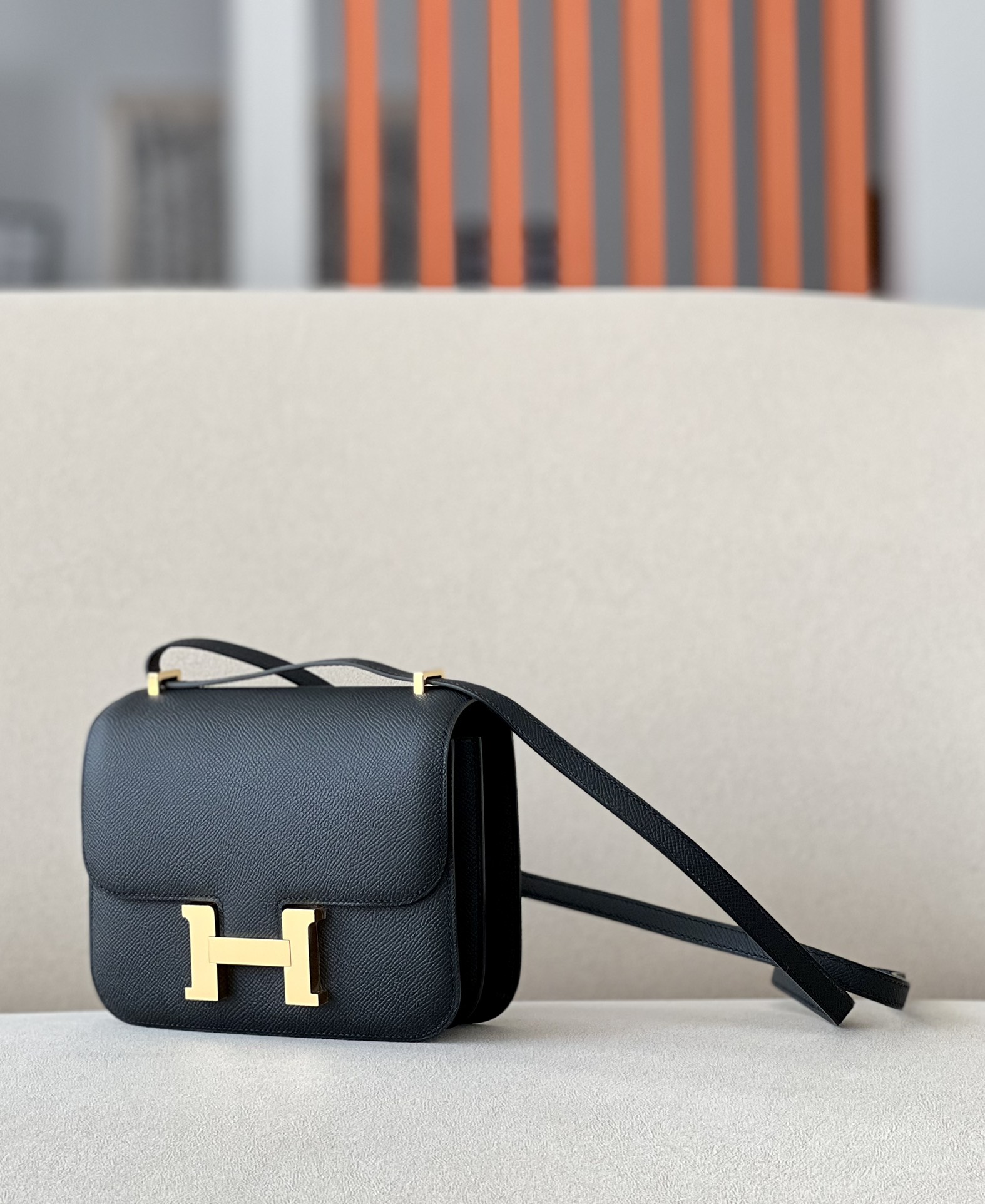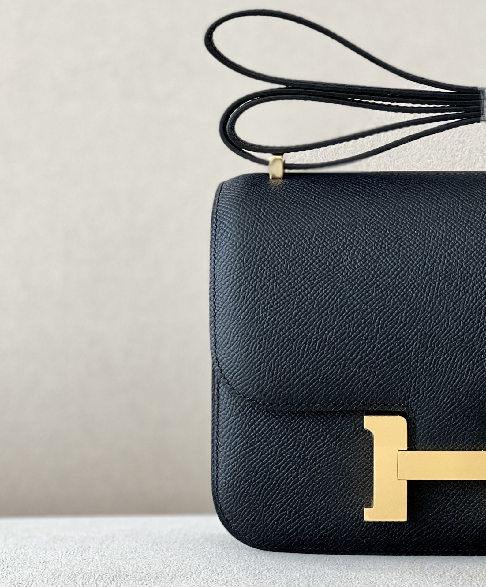 The bag features a long shoulder strap , including an H buckle on the flap.