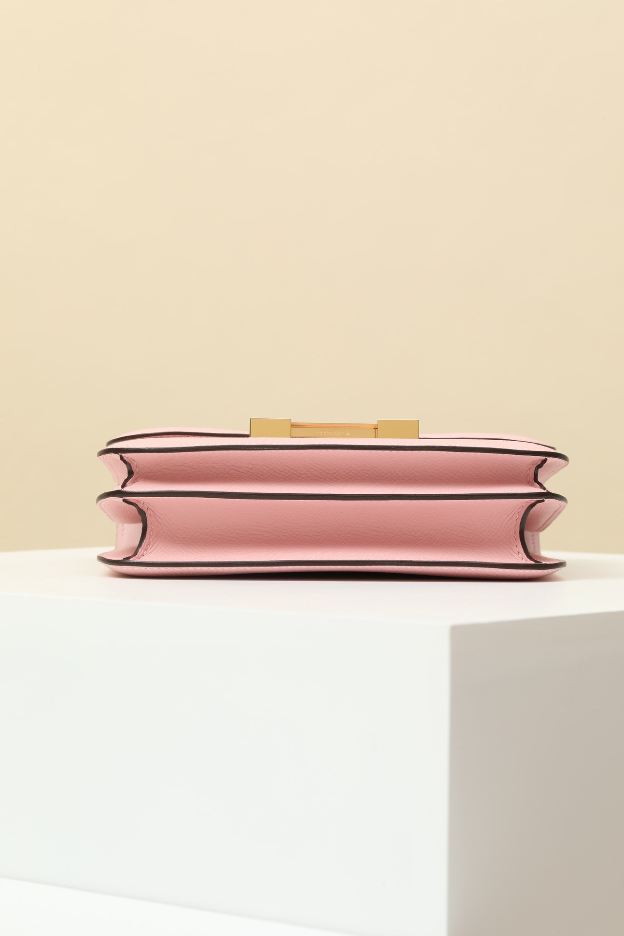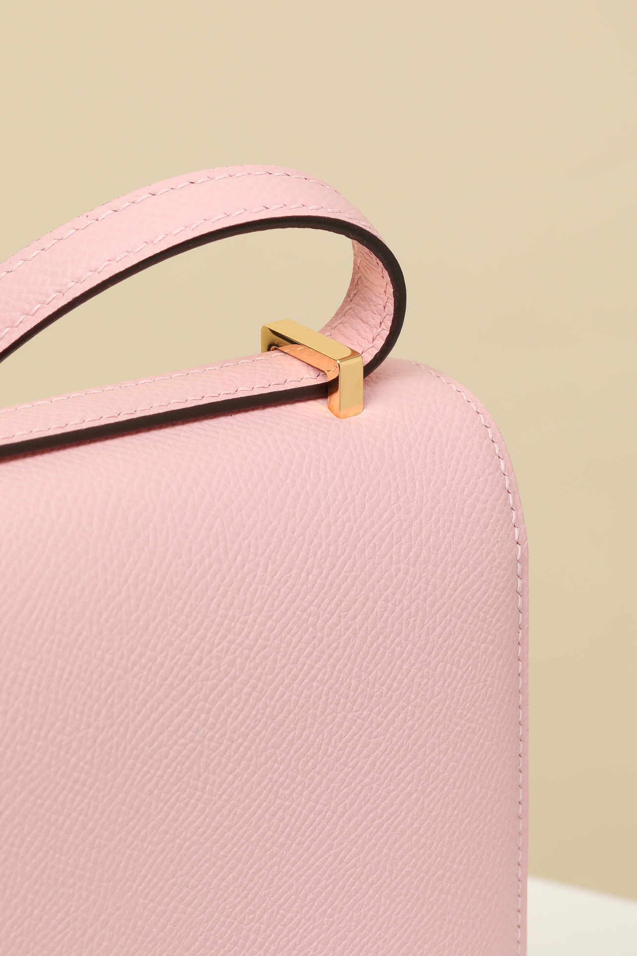 The bag features a long shoulder strap , including an H buckle on the flap.