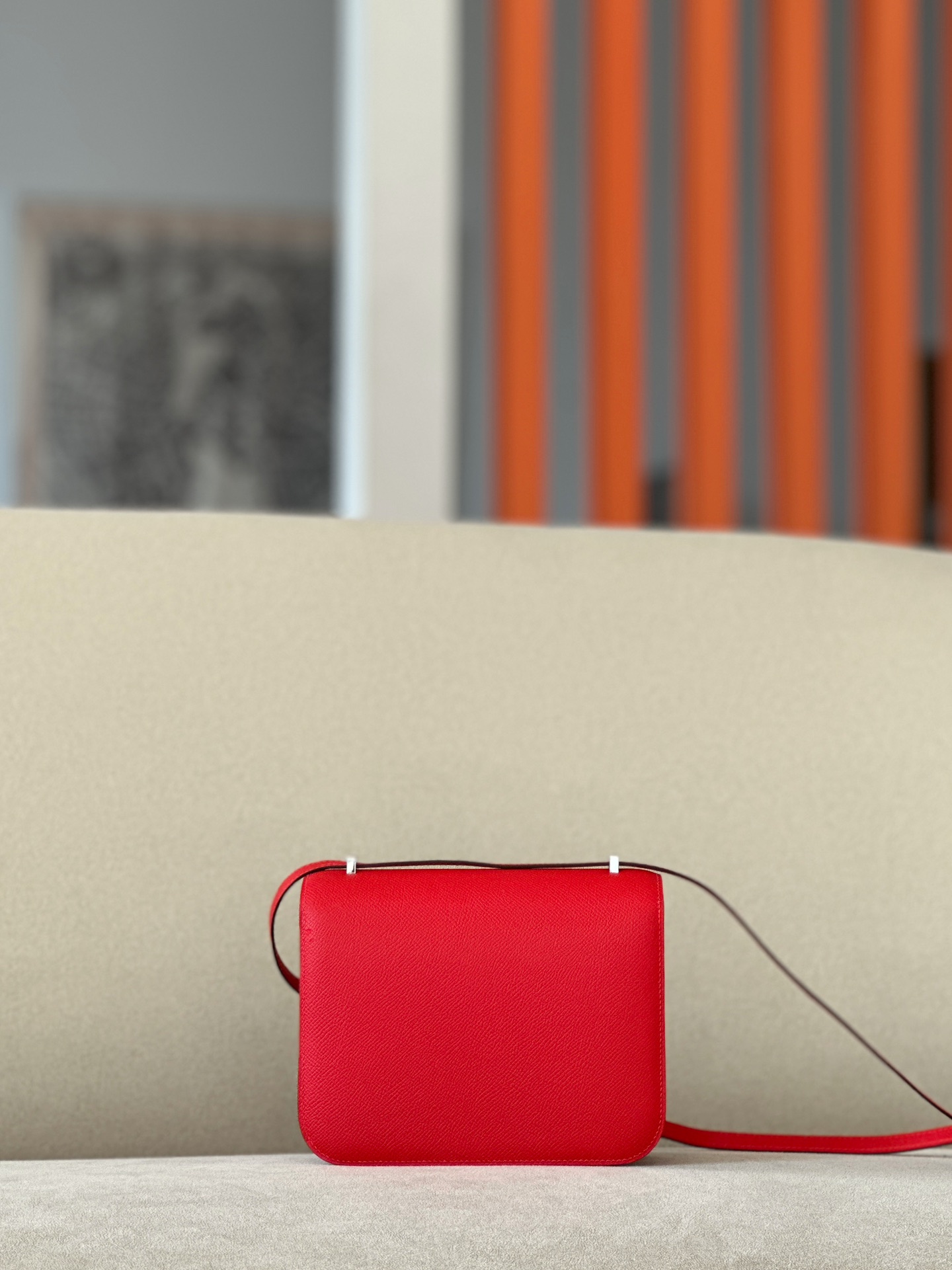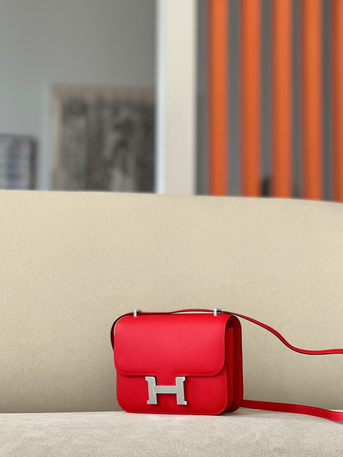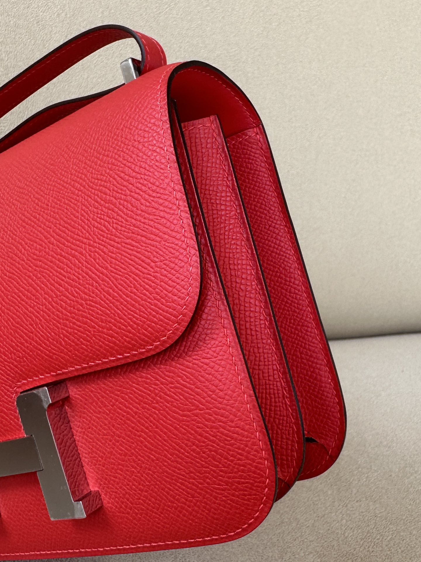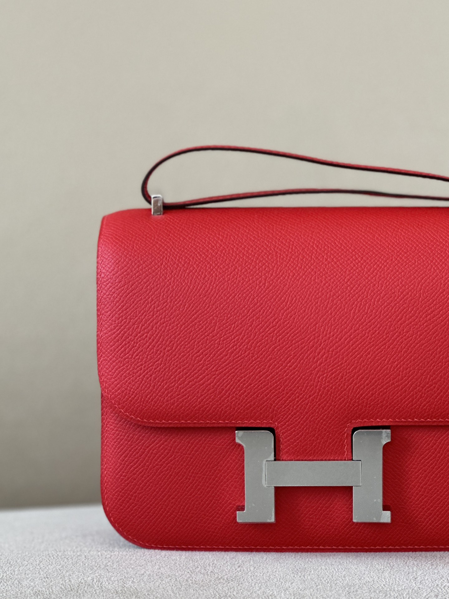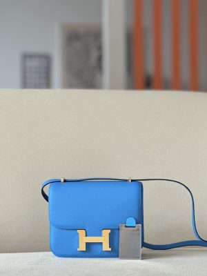 The bag features a long shoulder strap , including an H buckle on the flap.