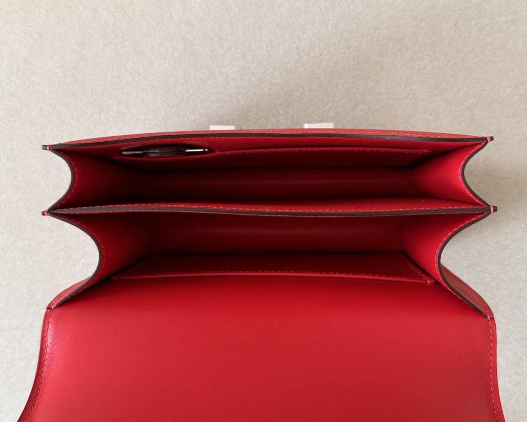 Lining in leather, two compartments, one patch pocket.