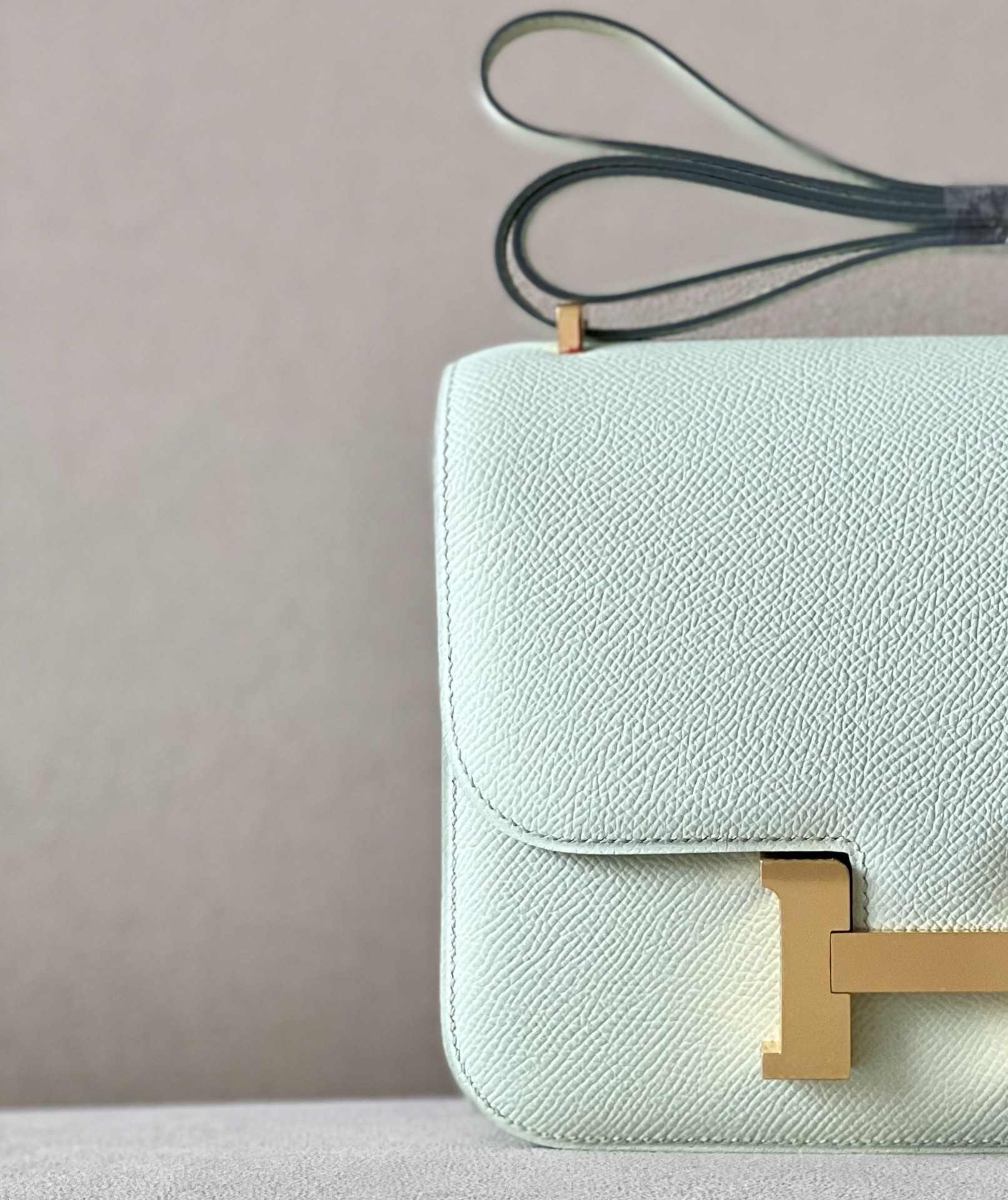 The bag features a long shoulder strap , including an H buckle on the flap.
