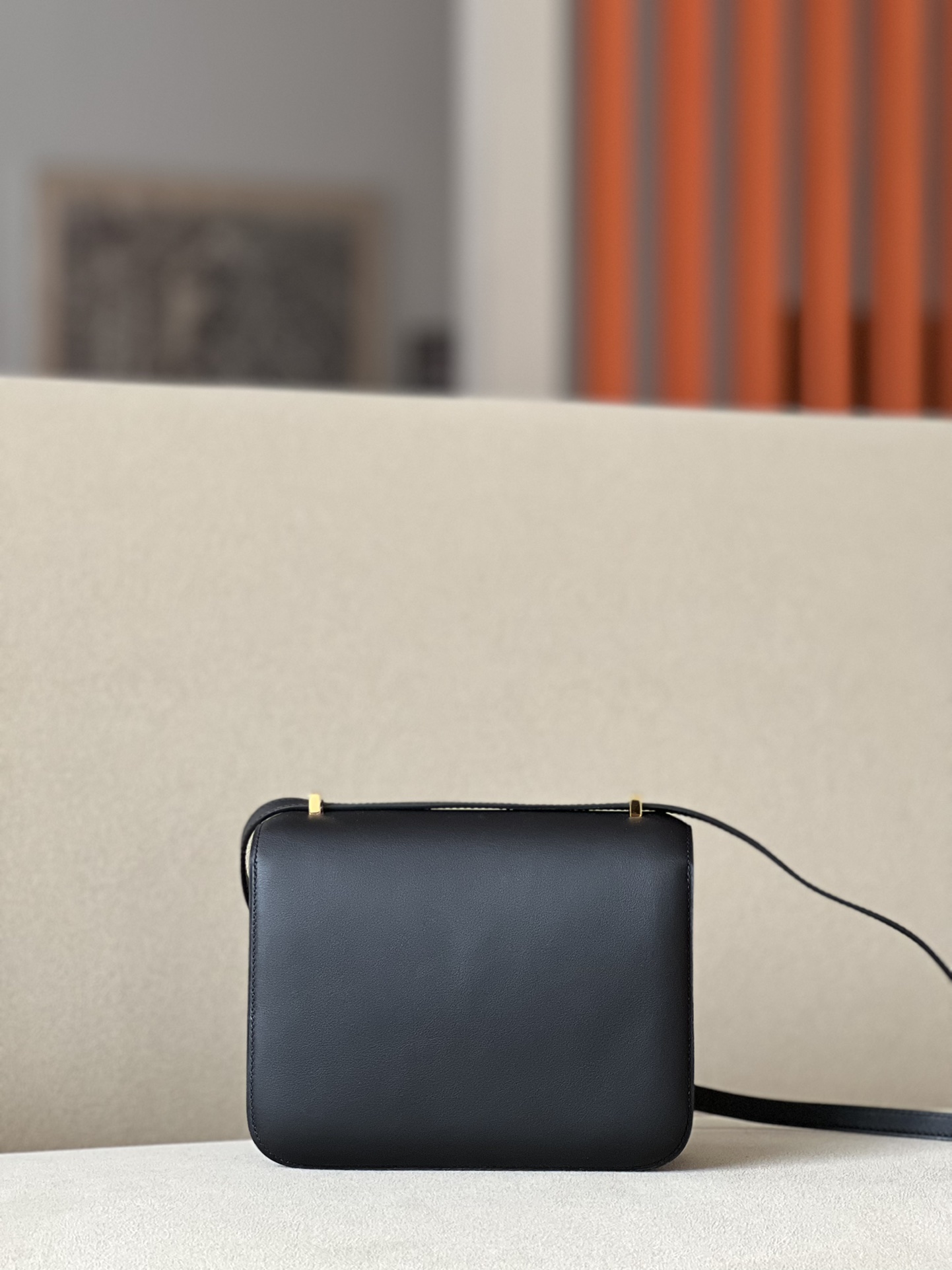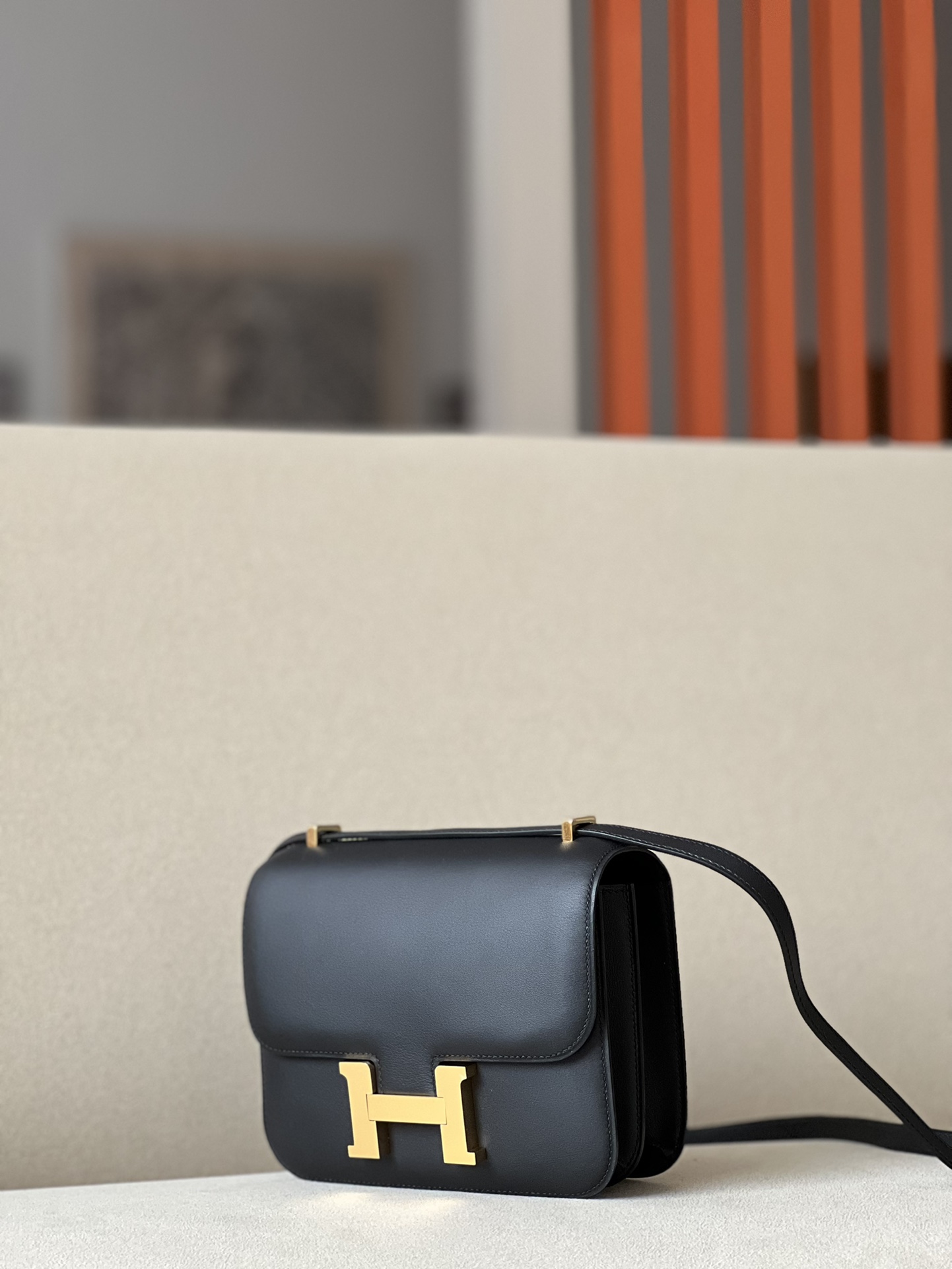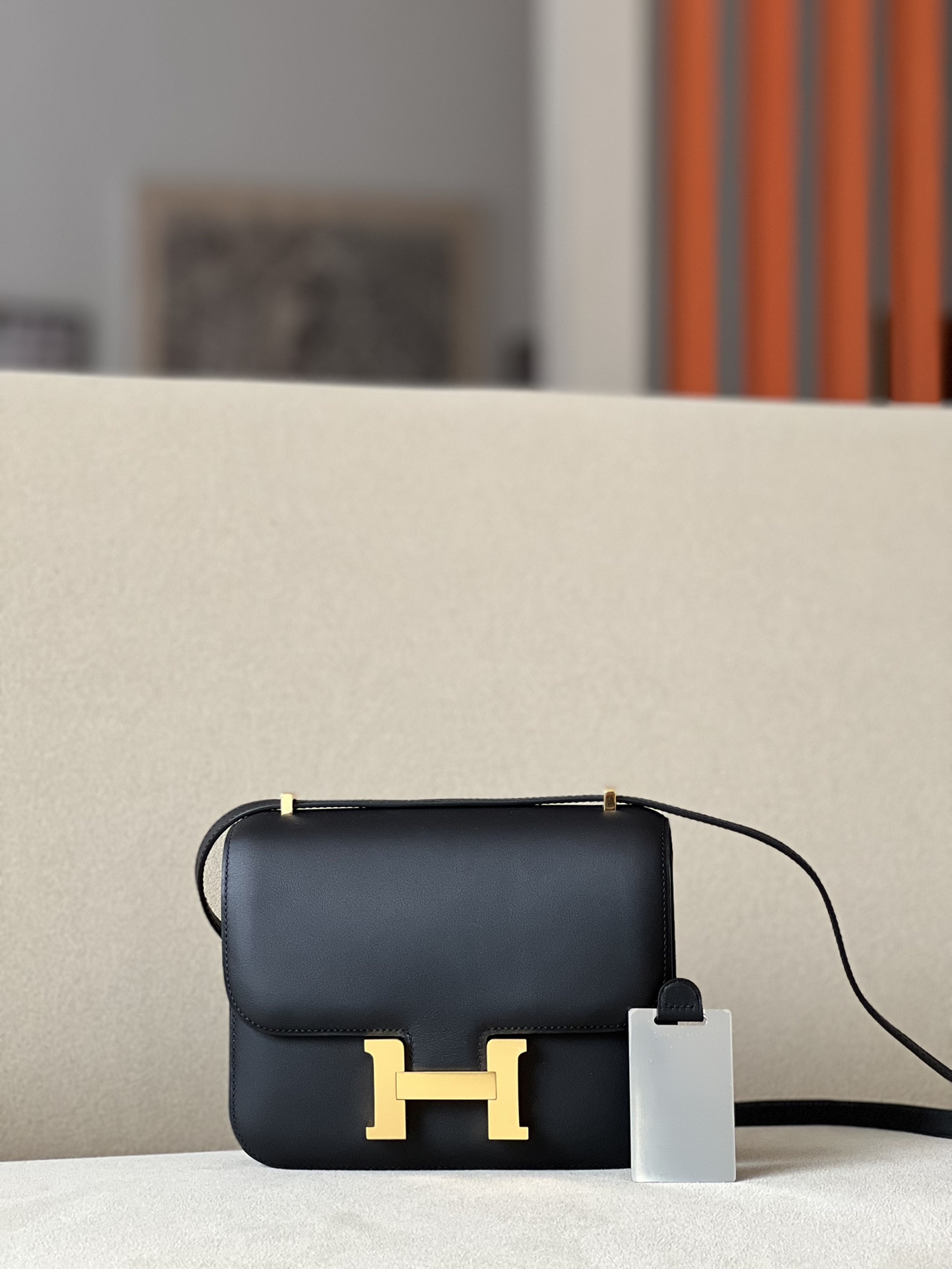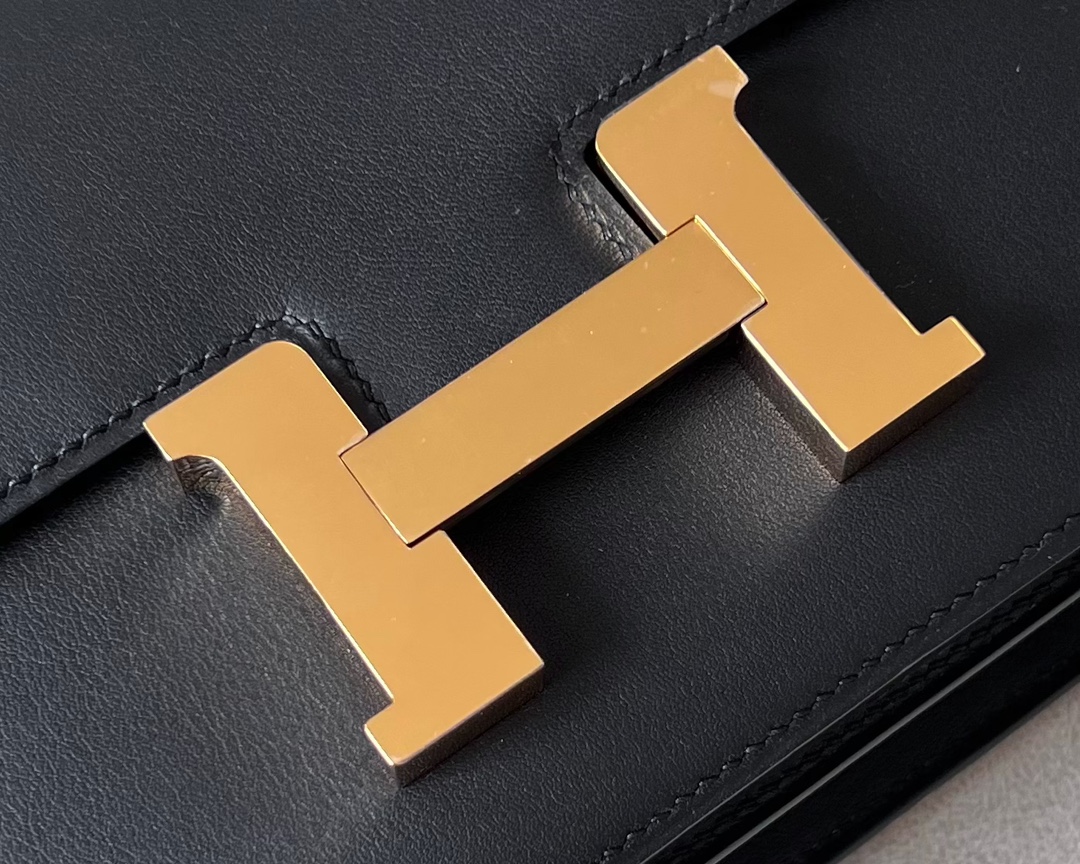 “The bag features a long shoulder strap , including an H buckle on the flap.