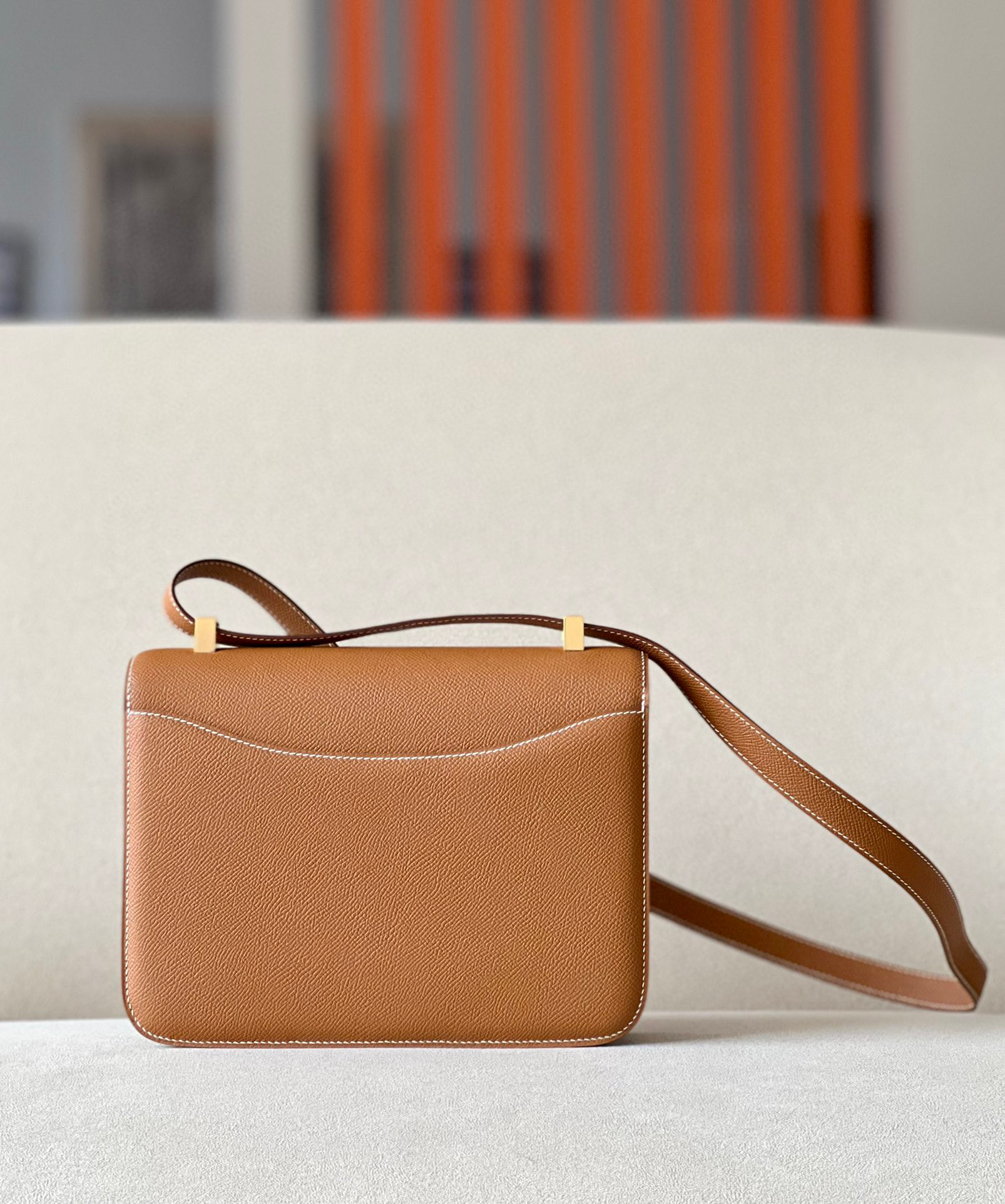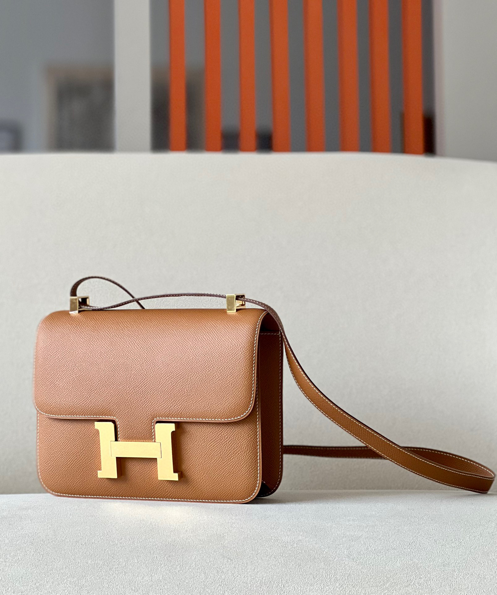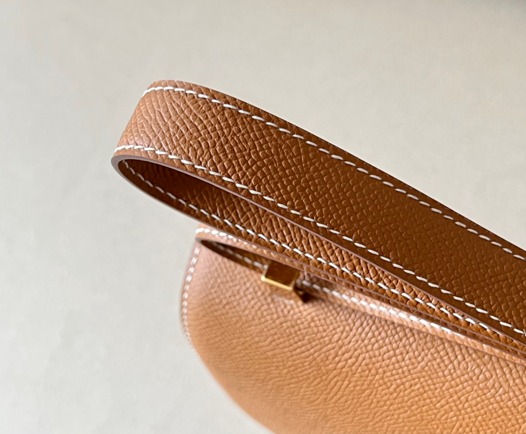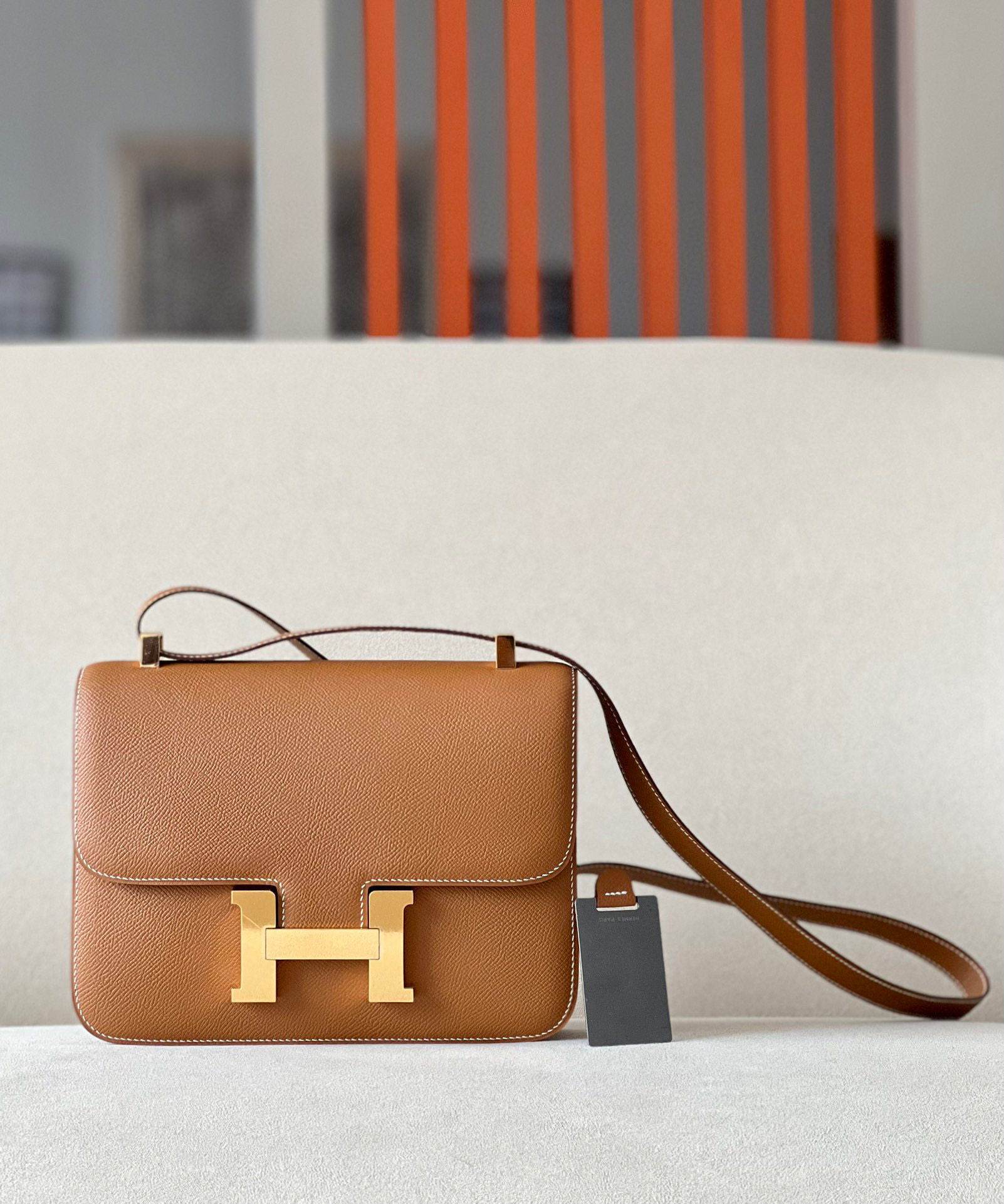 The bag features a long shoulder strap , including an H buckle on the flap.