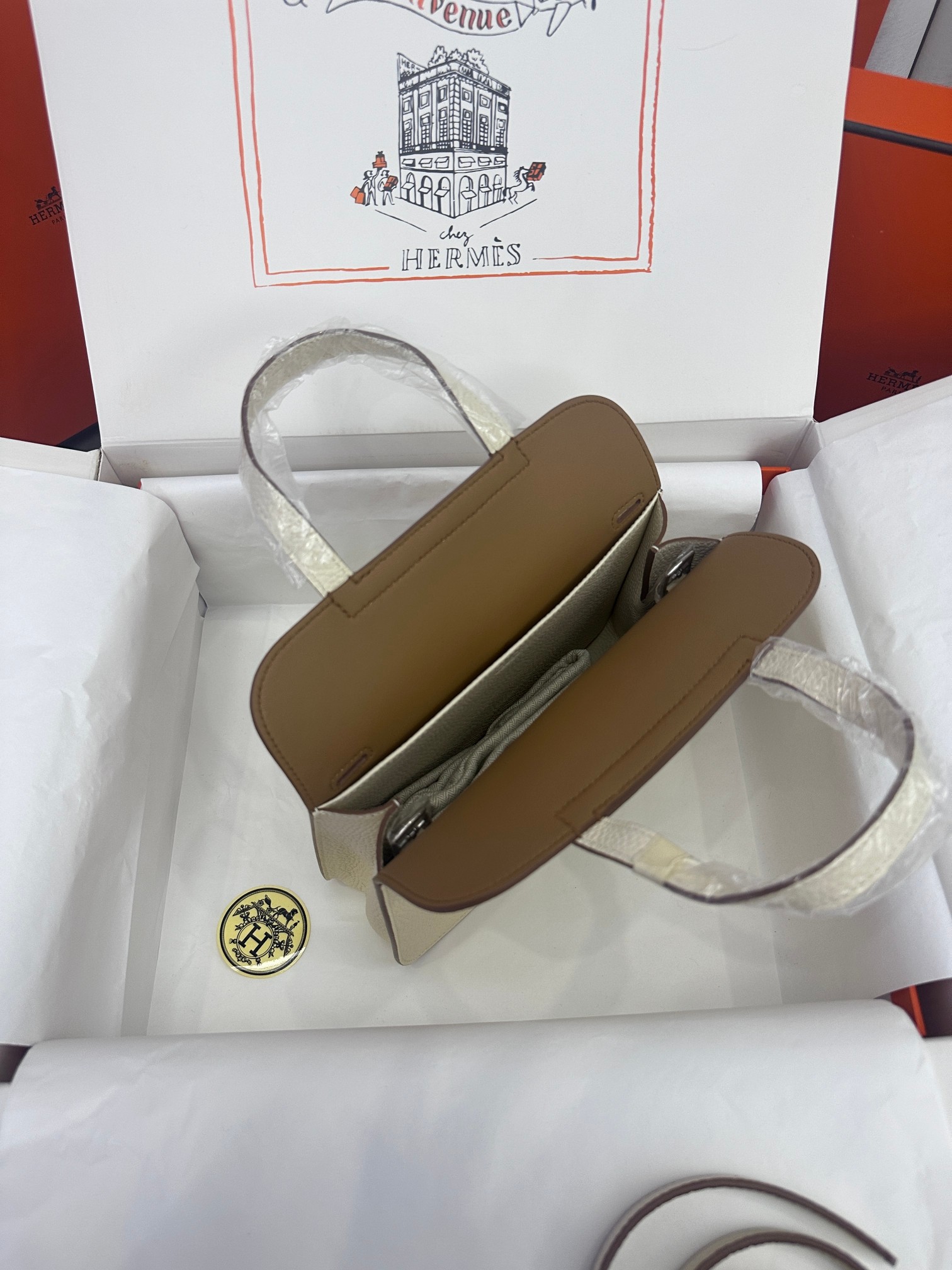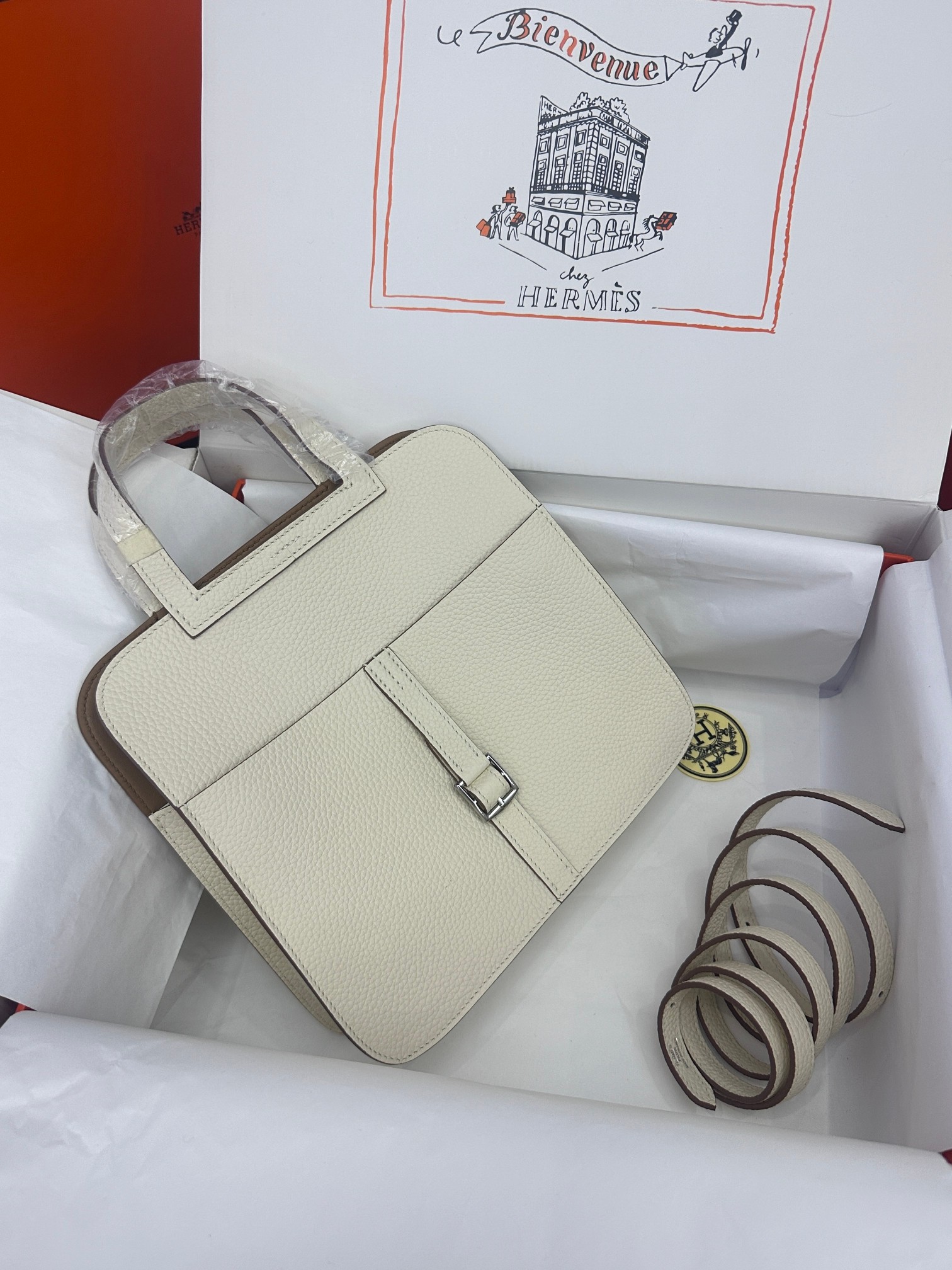 Includes ribbon, care booklet, , dust bag, paper bag and box.
