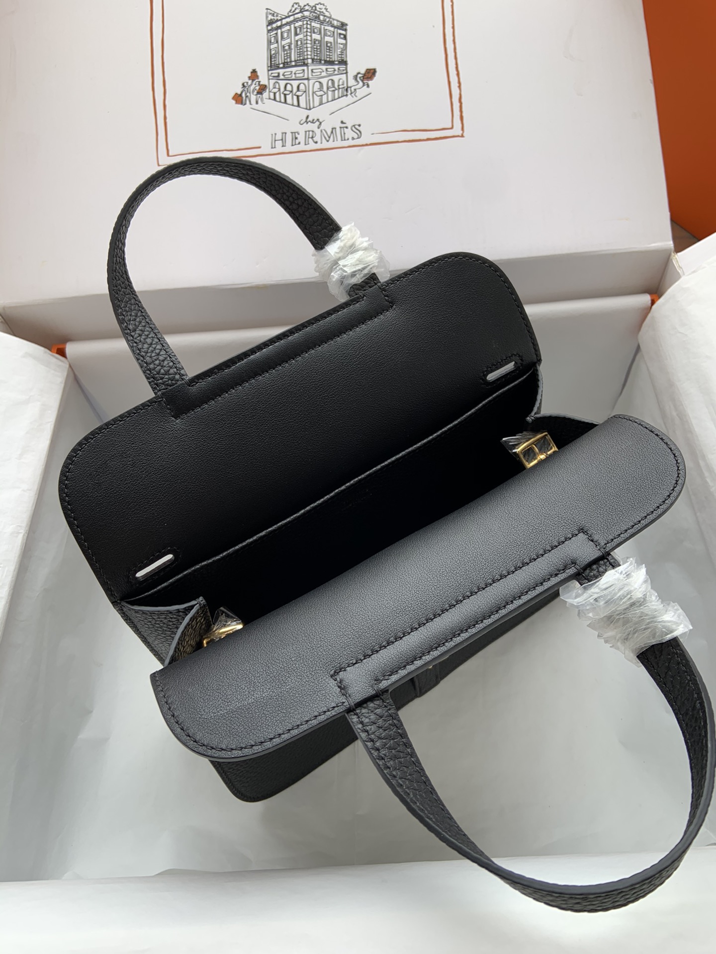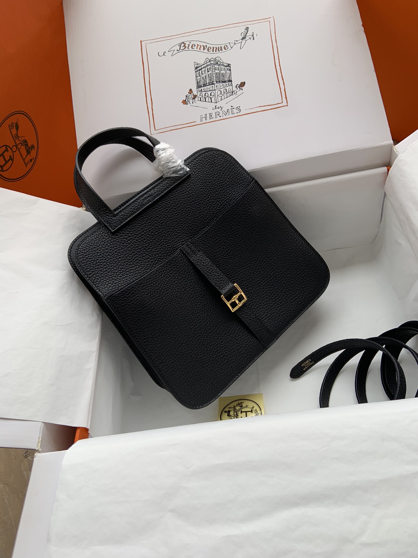 Includes ribbon, care booklet, , dust bag, paper bag and box.