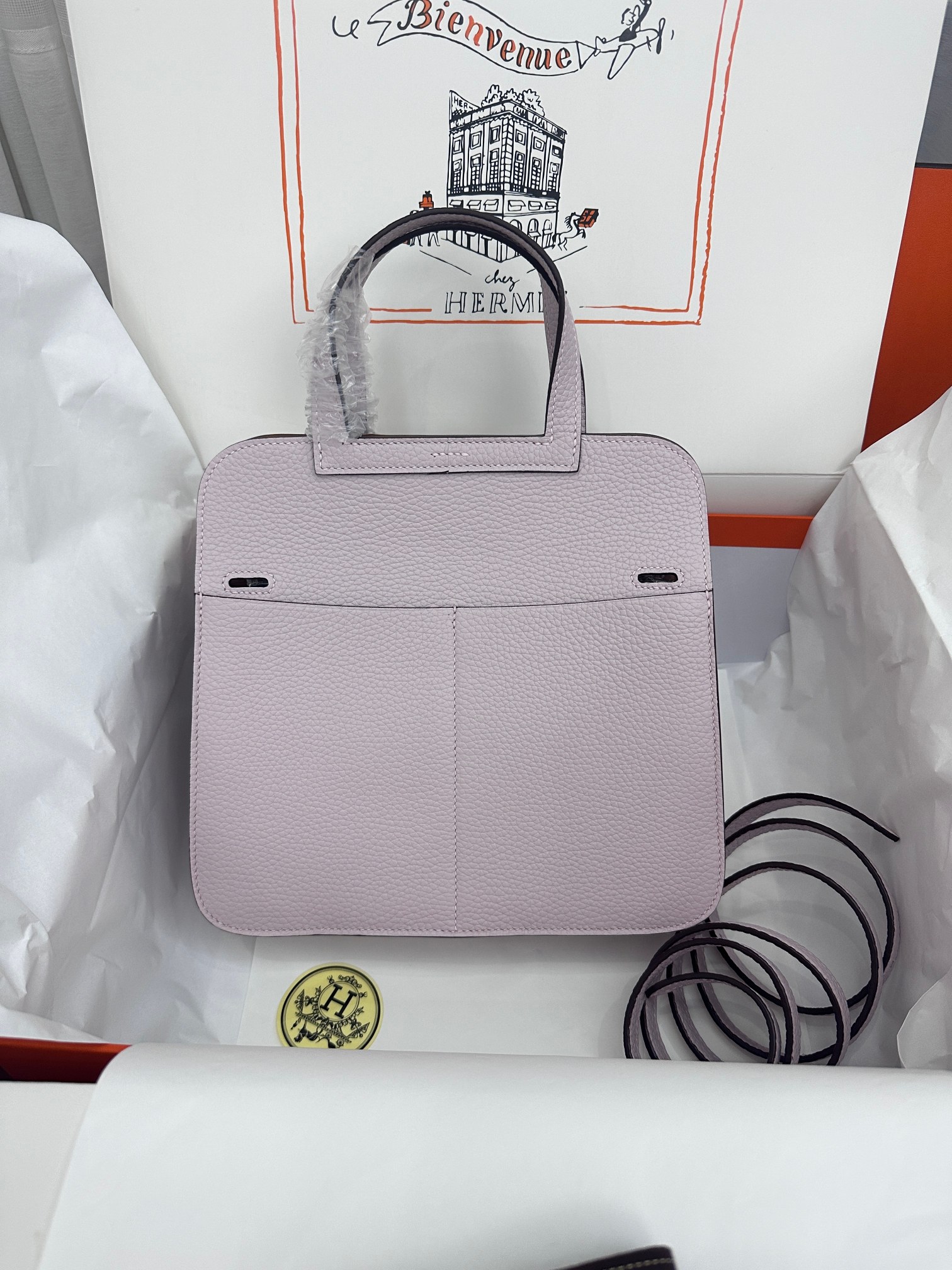 Includes ribbon, care booklet, , dust bag, paper bag and box.