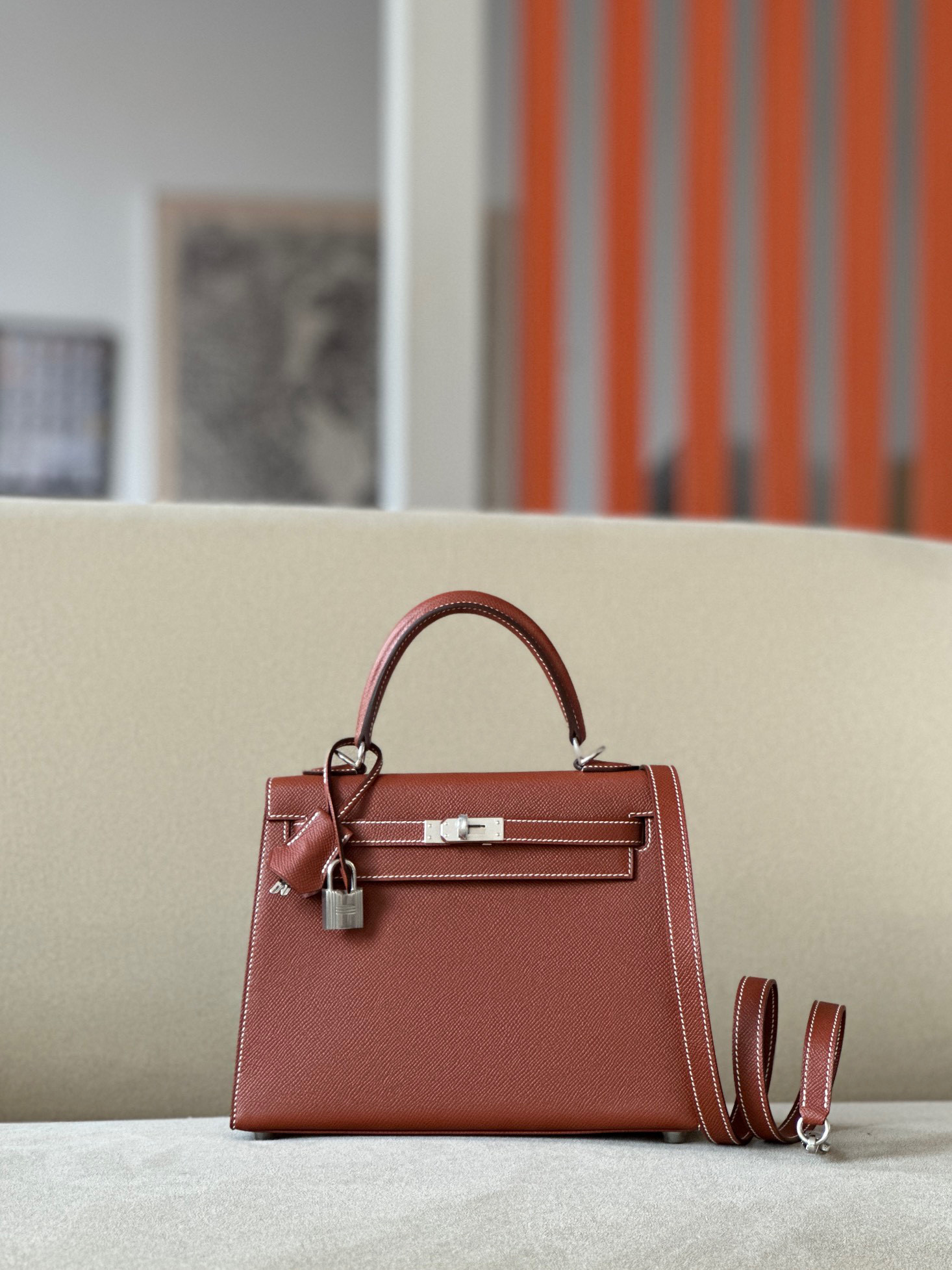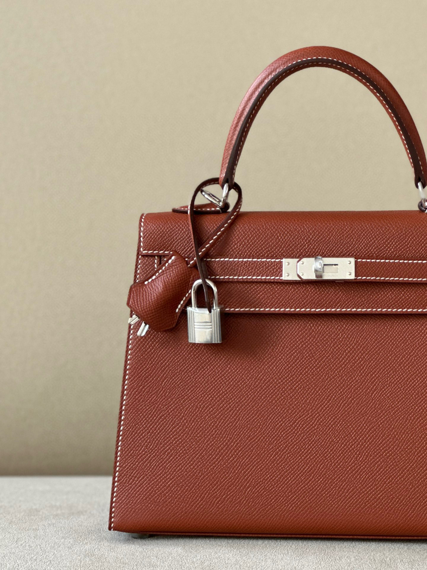Includes lock, two keys, clochette, clochette dust bag, ribbon, care booklet, raincoat, felt protector, dust bag, and box