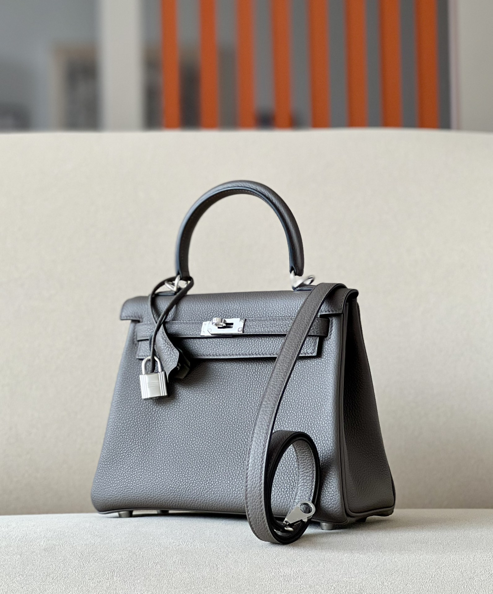 Includes lock, two keys, clochette, clochette dust bag, ribbon, care booklet, raincoat, felt protector, dust bag, and box .