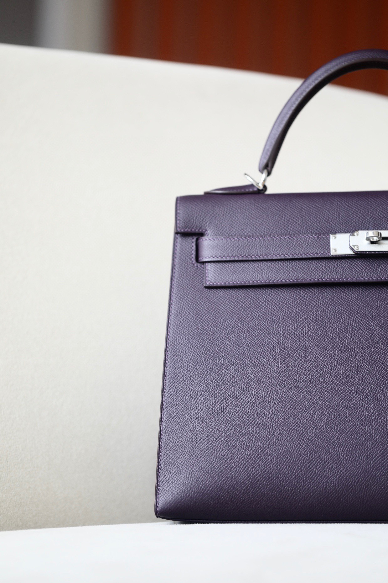 The interior is lined in chèvre leather.