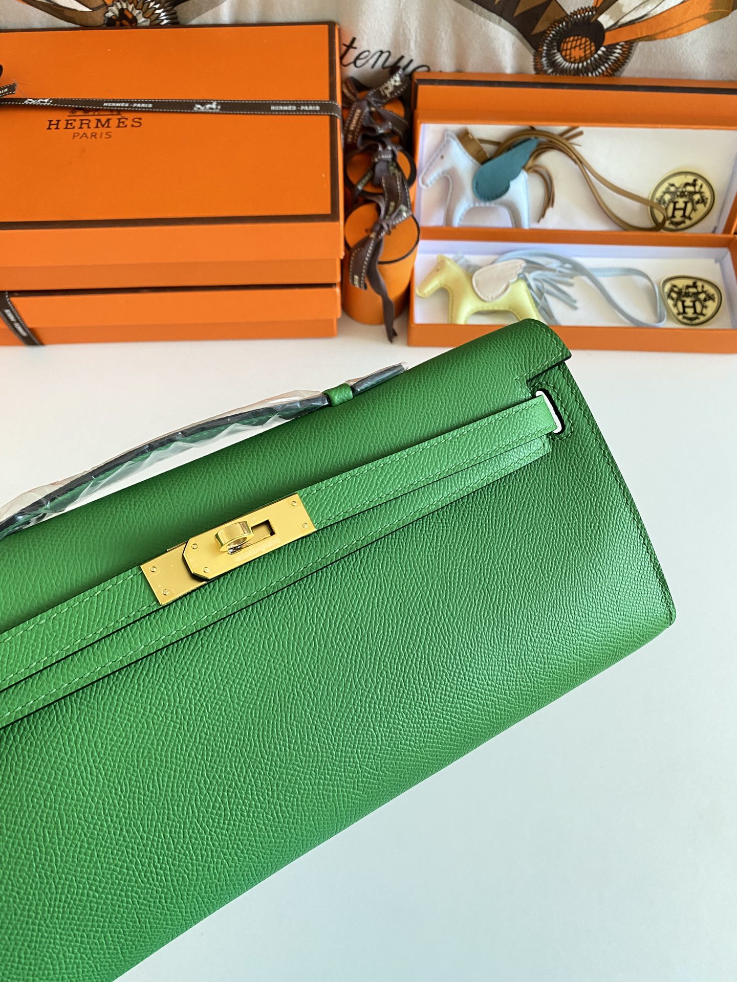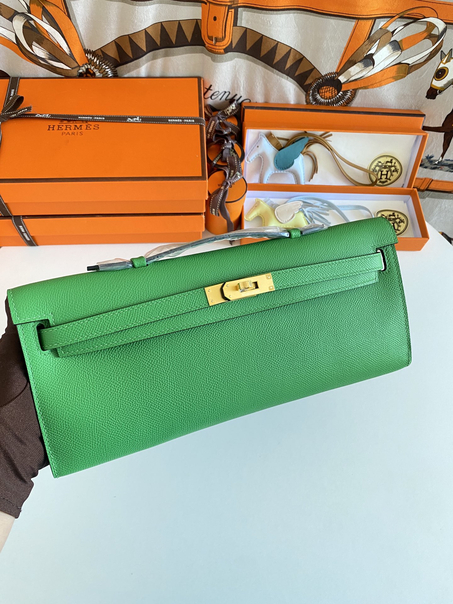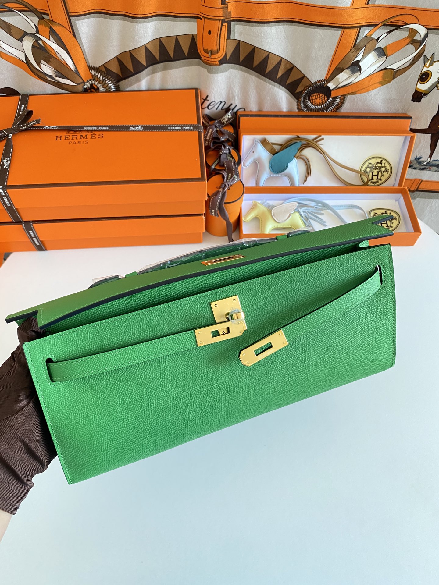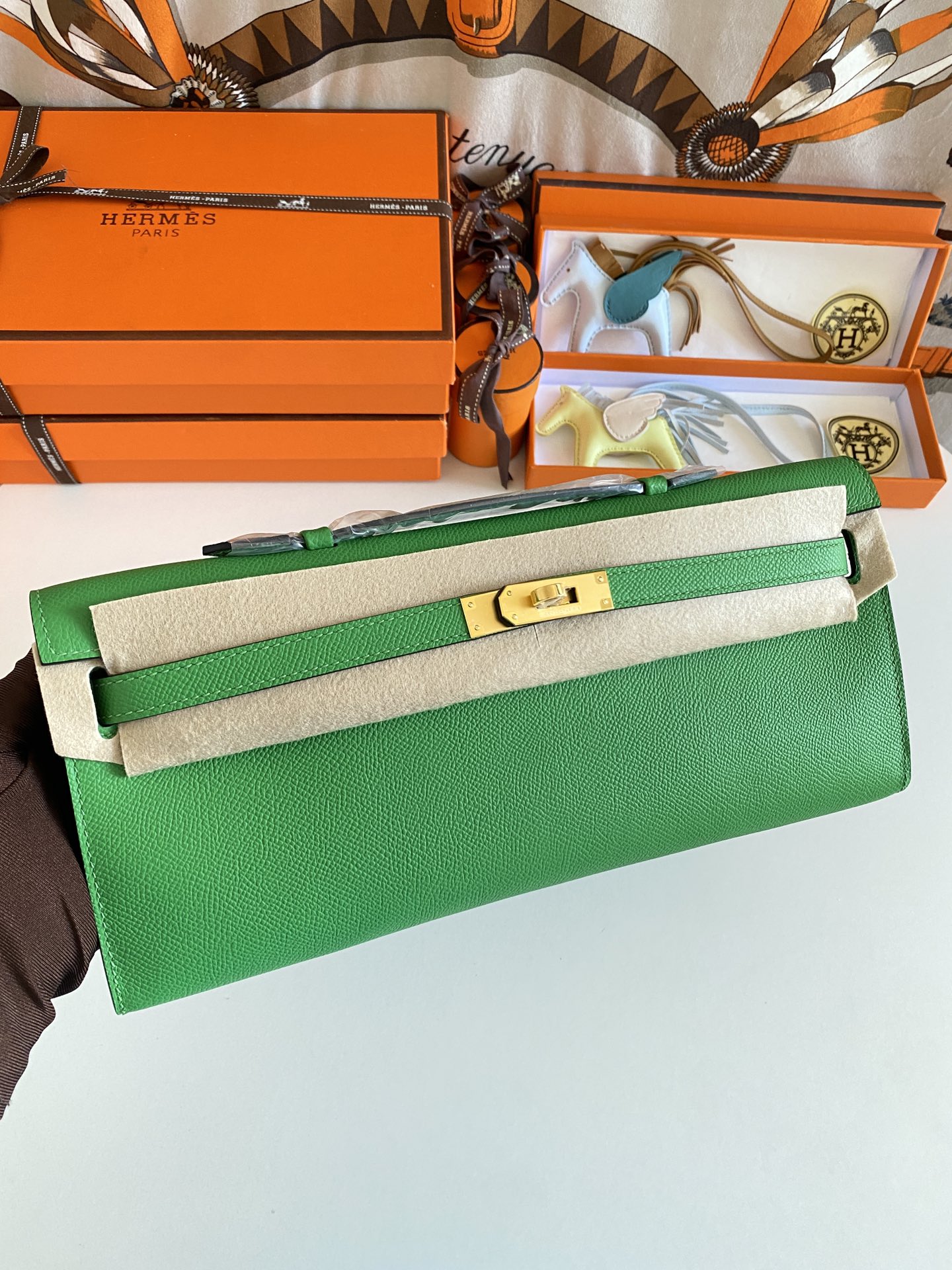 Includes ribbon, care booklet,dust bag, paper bag and box.