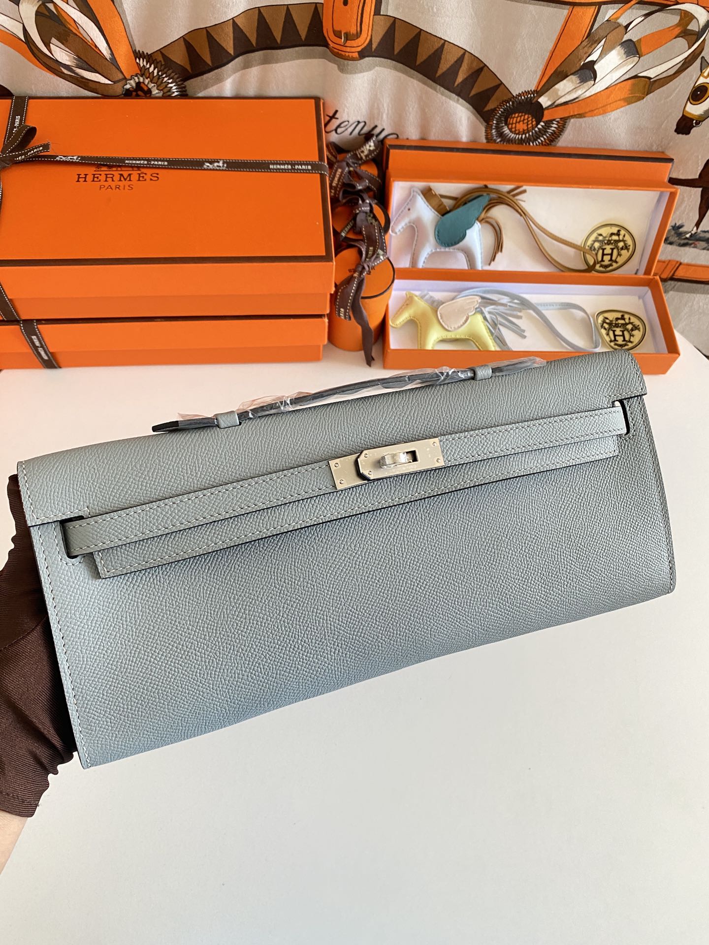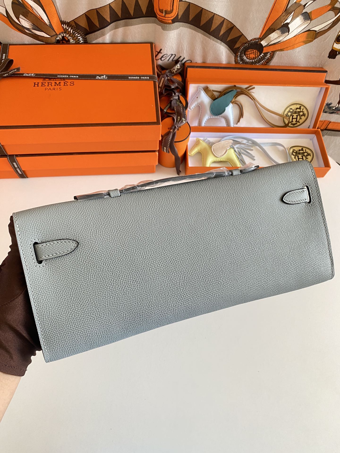 Includes ribbon, care booklet, , dust bag, paper bag and box.