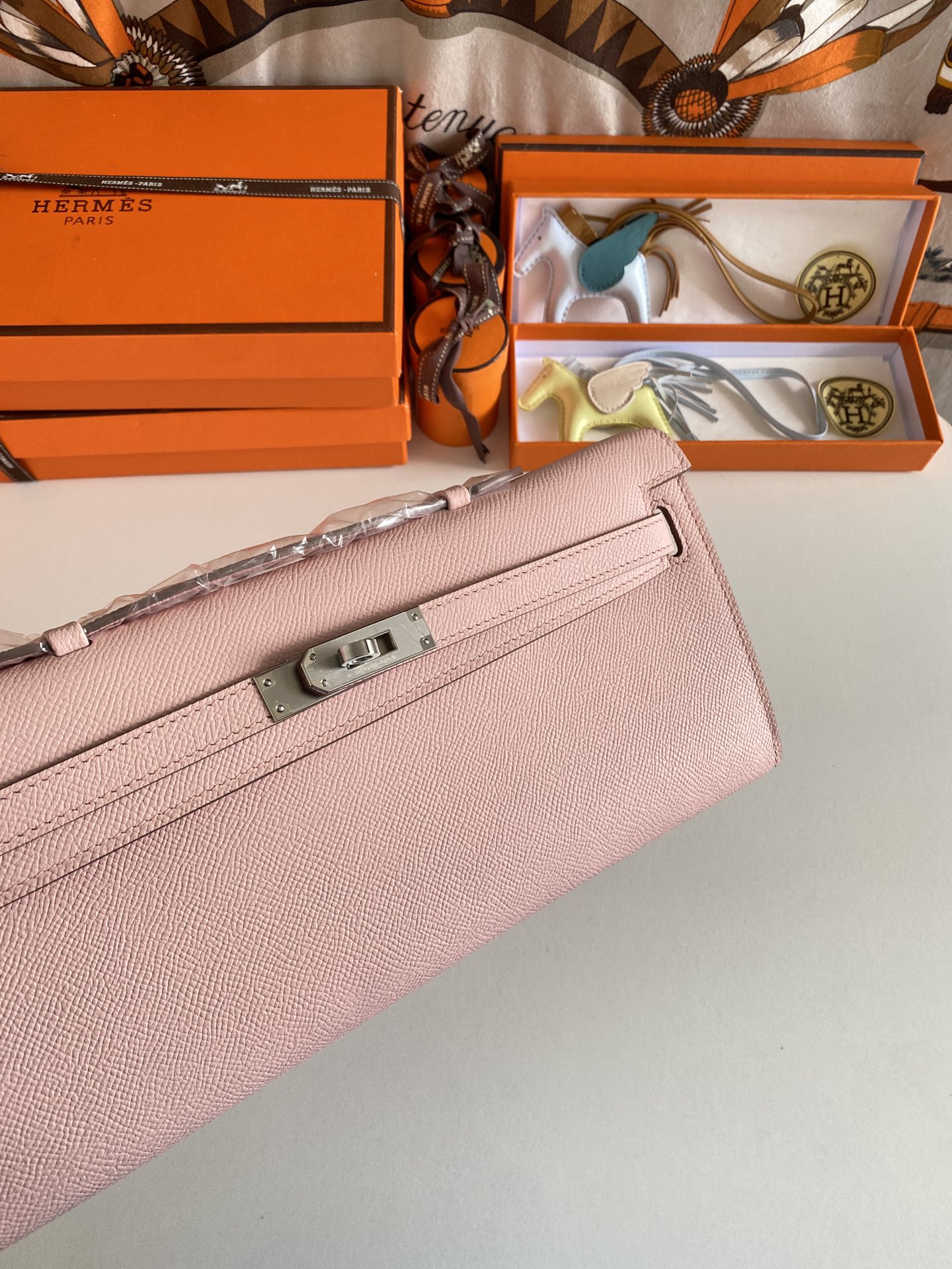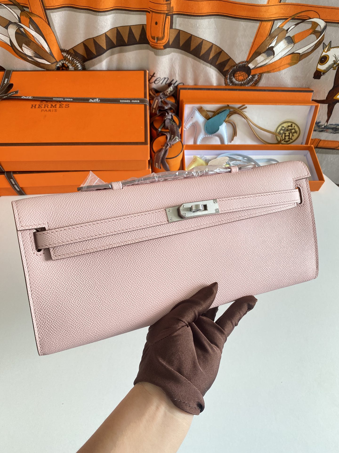 Includes ribbon, care booklet,dust bag, paper bag and box.