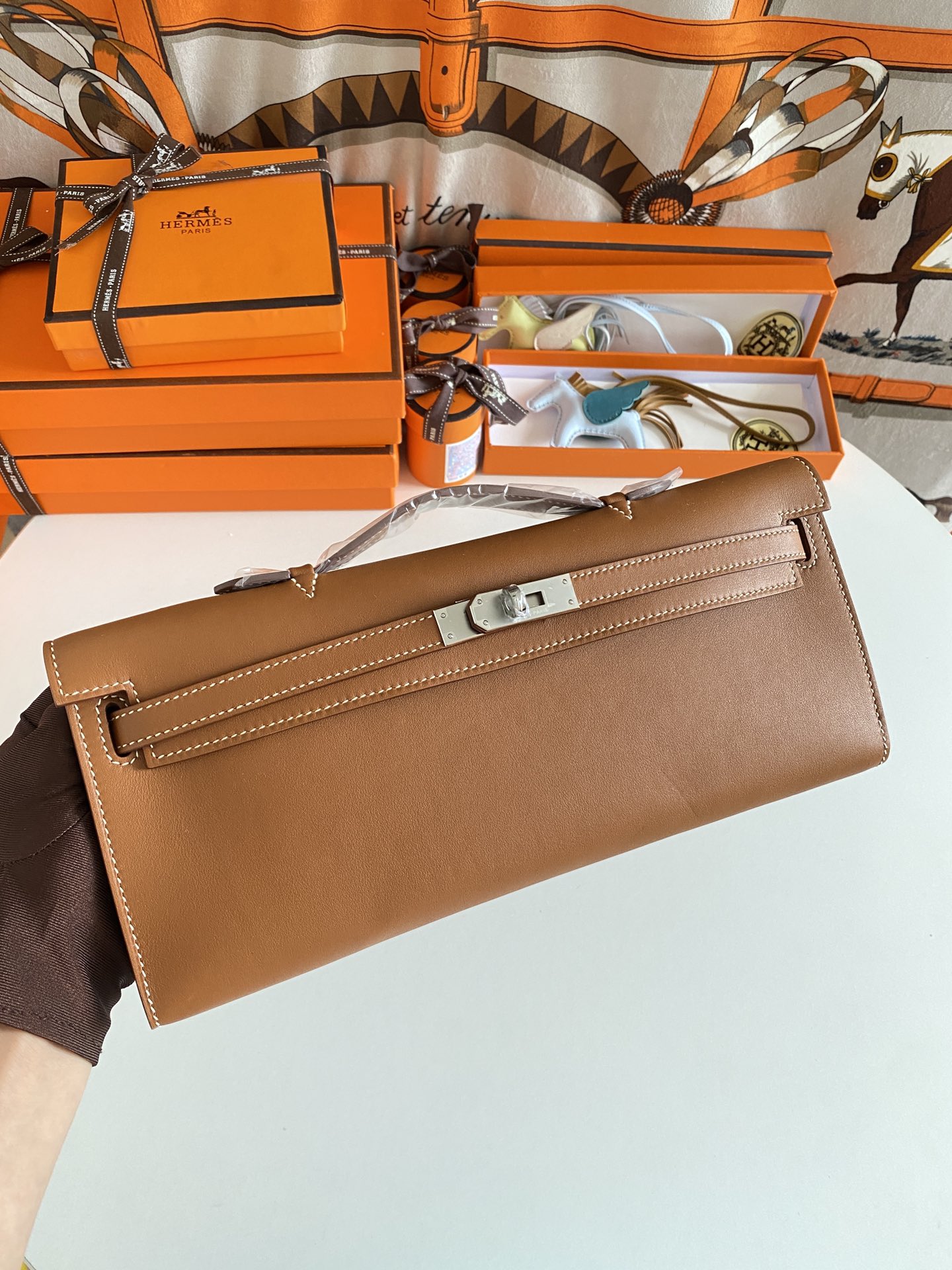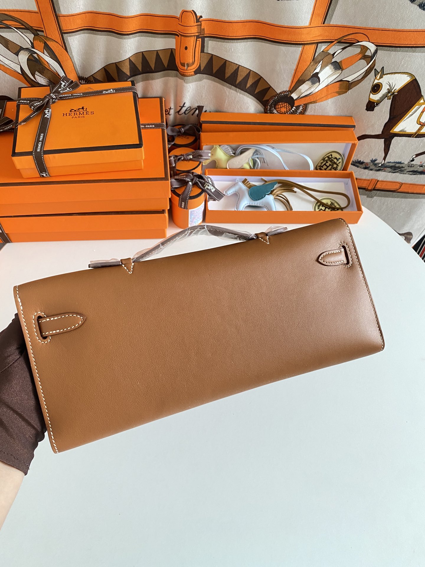 Includes ribbon, care booklet,dust bag, paper bag and box.