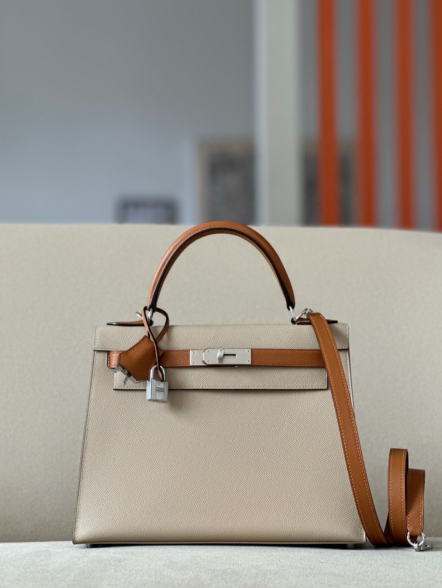 Includes lock, two keys, clochette, clochette dust bag, ribbon, care booklet, raincoat, felt protector, dust bag, and box