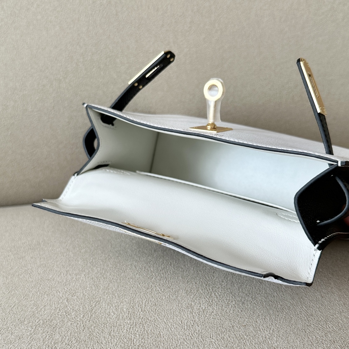 The interior is lined in chèvre leather.