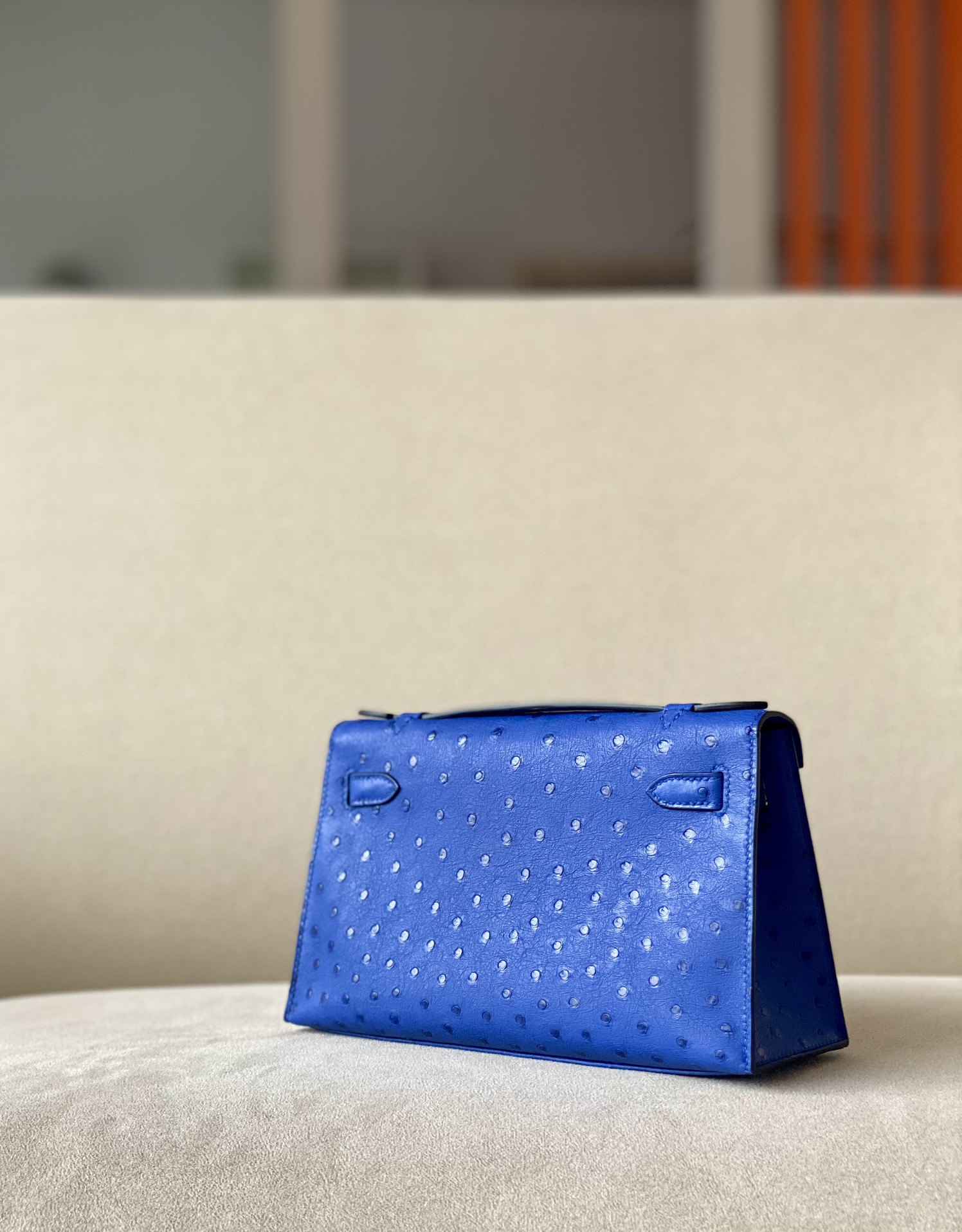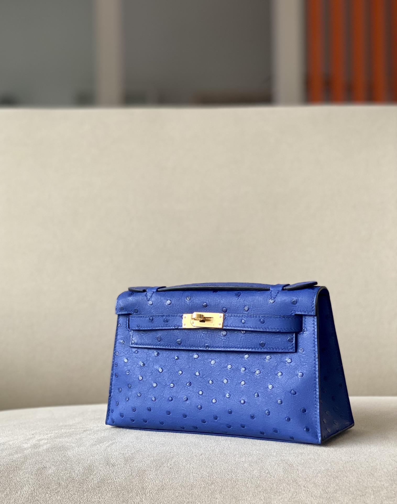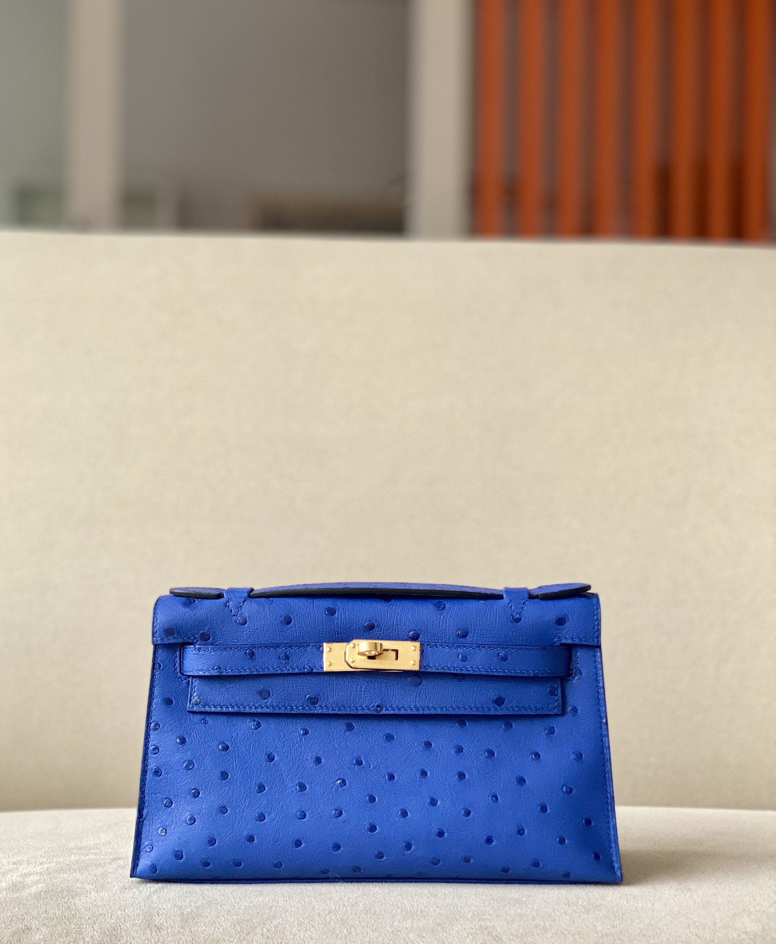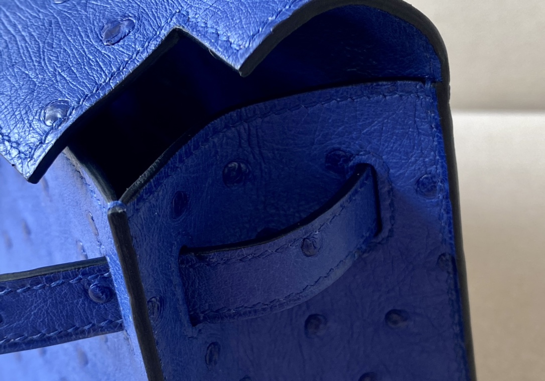 Kelly Pochette Ostrich Bleu Lin (J7) Gold Hardware