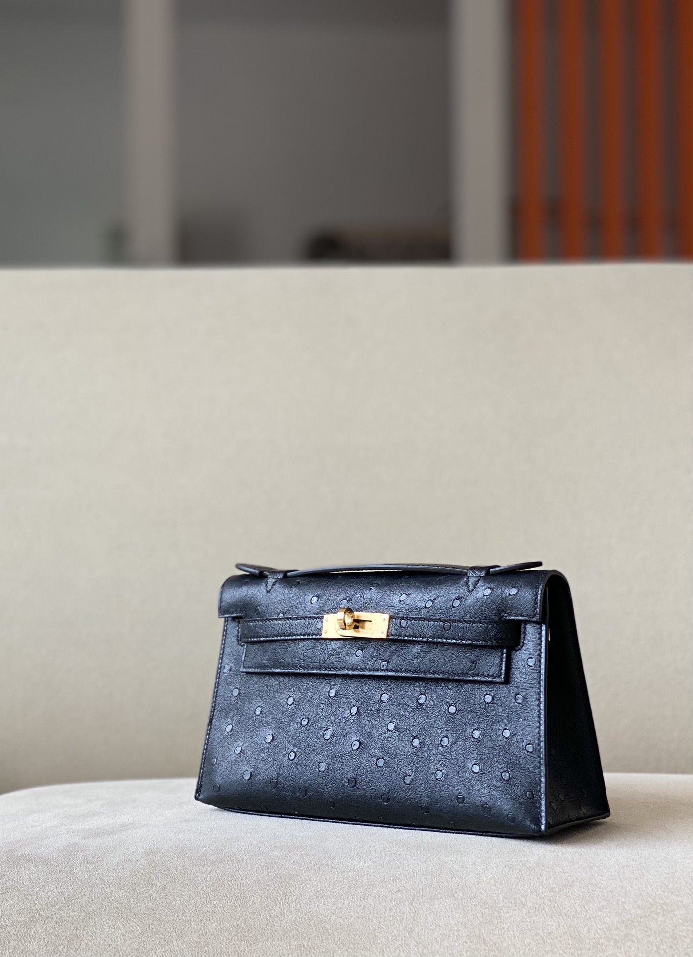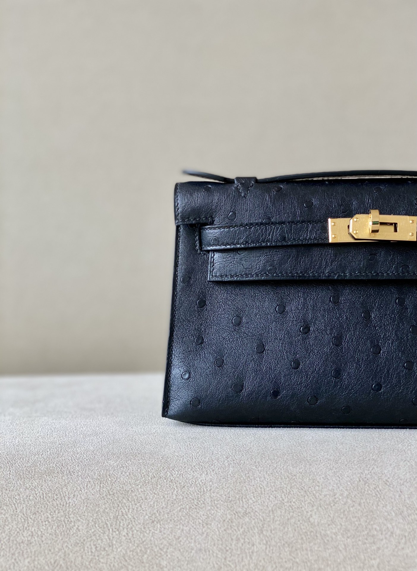 Kelly Pochette Ostrich Beton (8L) Gold Hardware